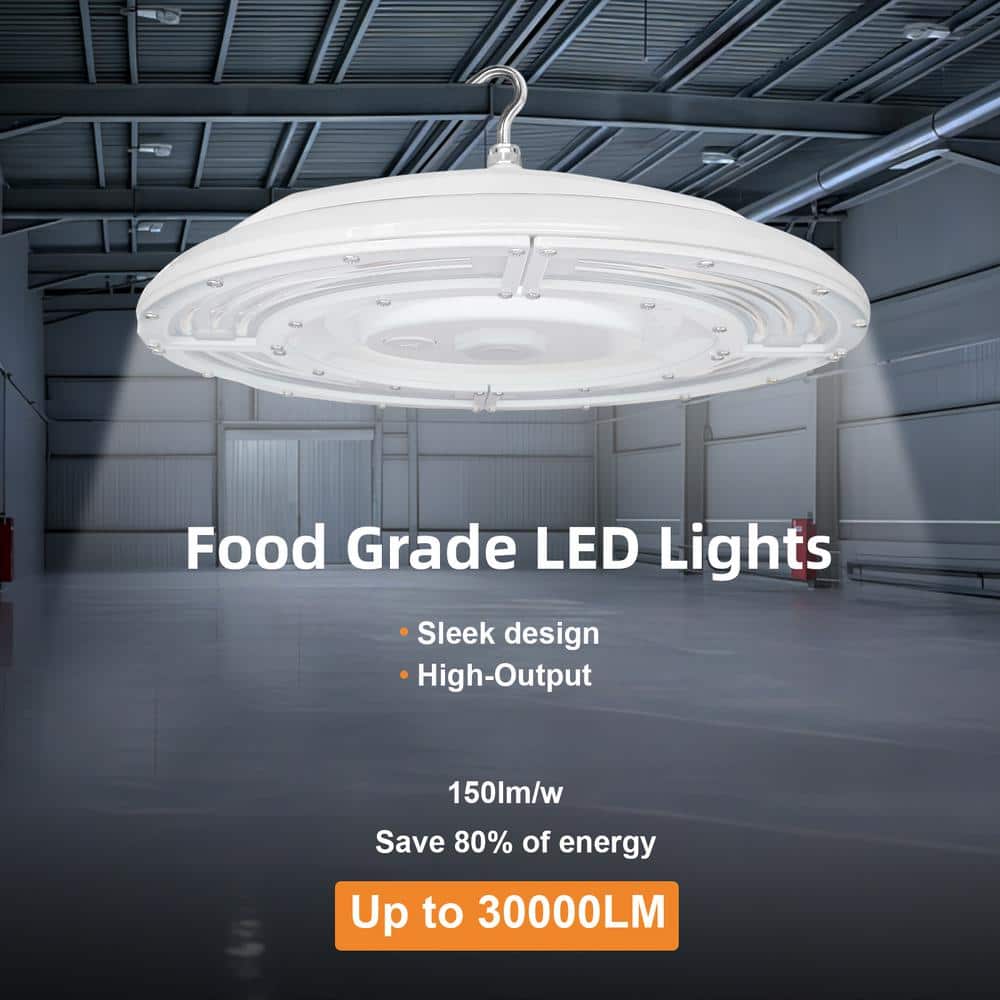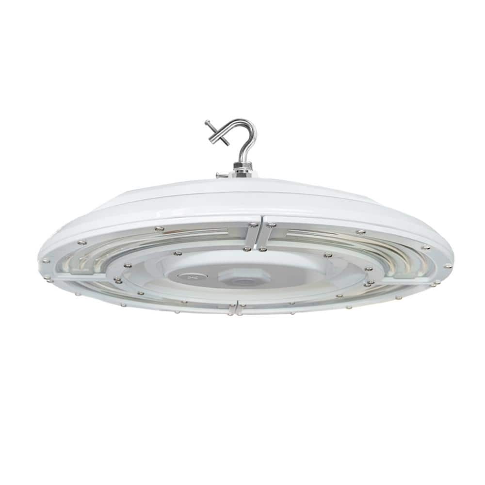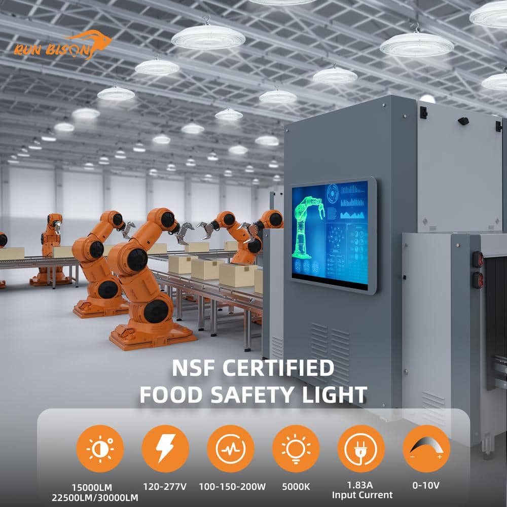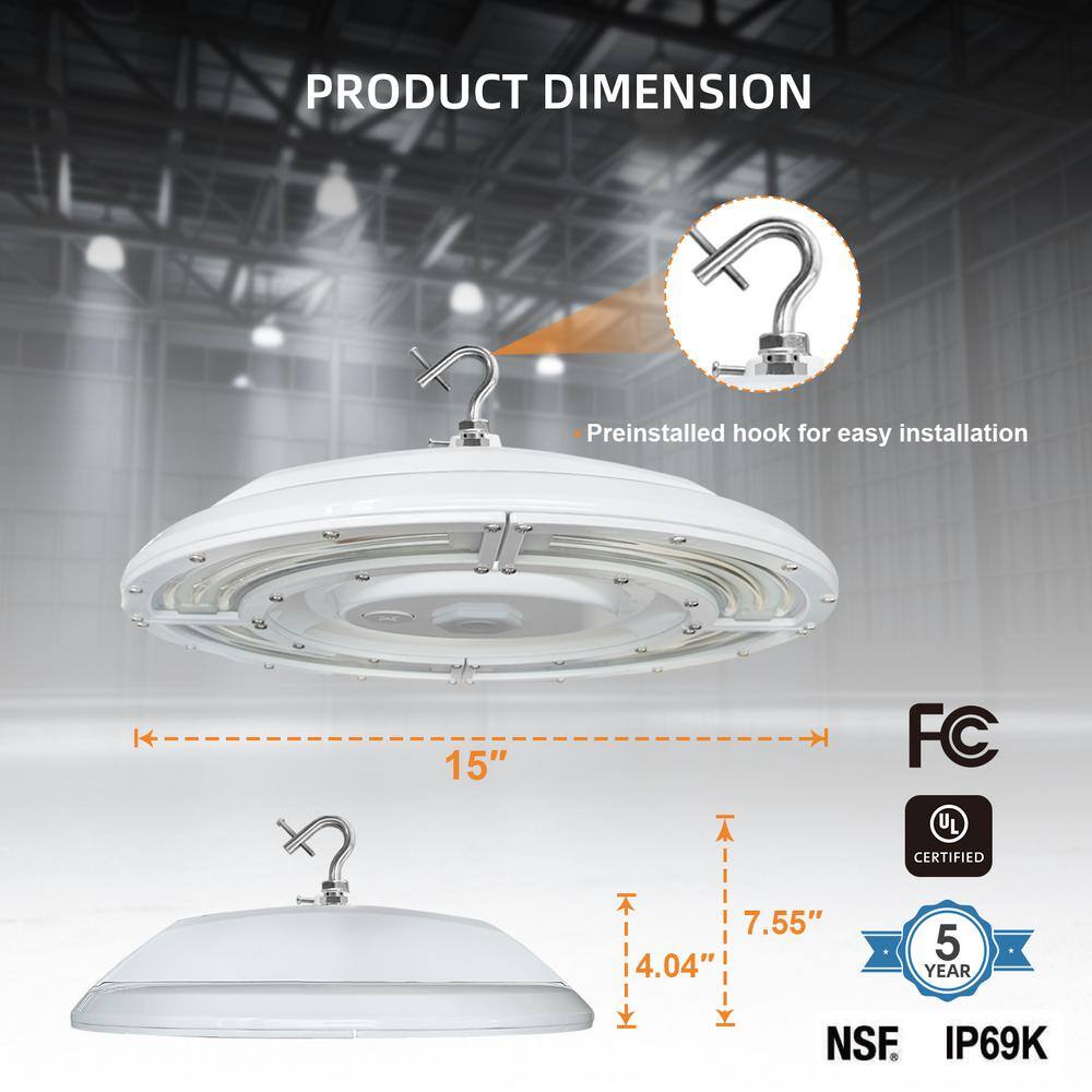Illuminate large spaces with the RUN BISON 15 in. White 30,000 Lumens Integrated LED Dimmable UFO High Bay Light Fixture. Designed for high ceilings, this fixture provides energy-efficient lighting, boasts a sleek aluminum alloy body with an NSF certification for food safety, and ensures durability with IP65 waterproof and dustproof protection.