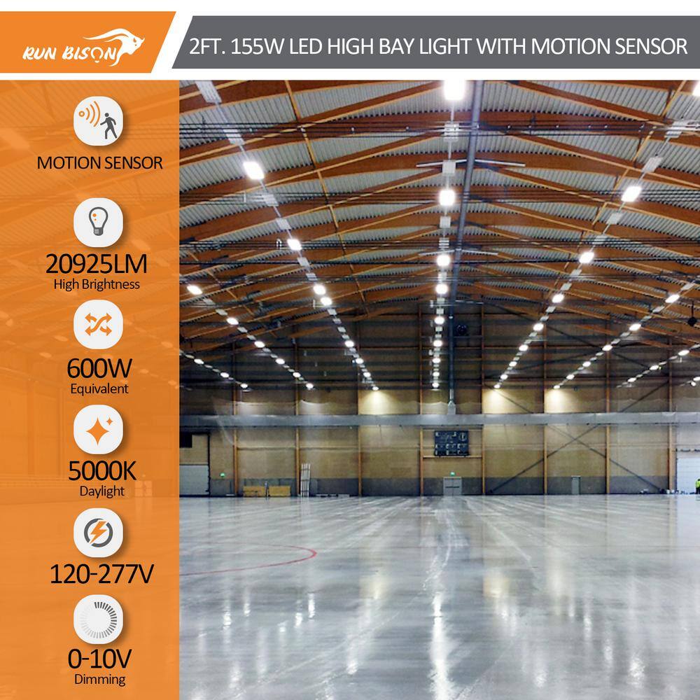 Illuminate large spaces efficiently with the RUN BISON 2 ft. LED High Bay Light. With an impressive 20,925 Lumens output and integrated motion sensor technology, this fixture ensures bright, targeted lighting and significant energy savings. Ideal for commercial facilities, it combines durability and smart functionality for superior illumination.