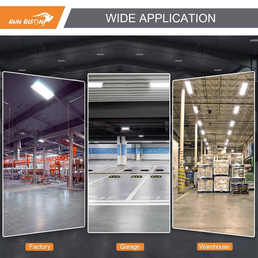 Illuminate large spaces efficiently with the RUN BISON 2 ft. 800-Watt Equivalent Integrated LED High Bay Light. Delivering a powerful 28,350 lumens at a crisp 5000K Daylight, this energy-saving fixture is perfect for warehouses, factories, and gyms. Enjoy up to 60% energy savings compared to traditional lighting, with durable performance lasting over 50,000 hours.