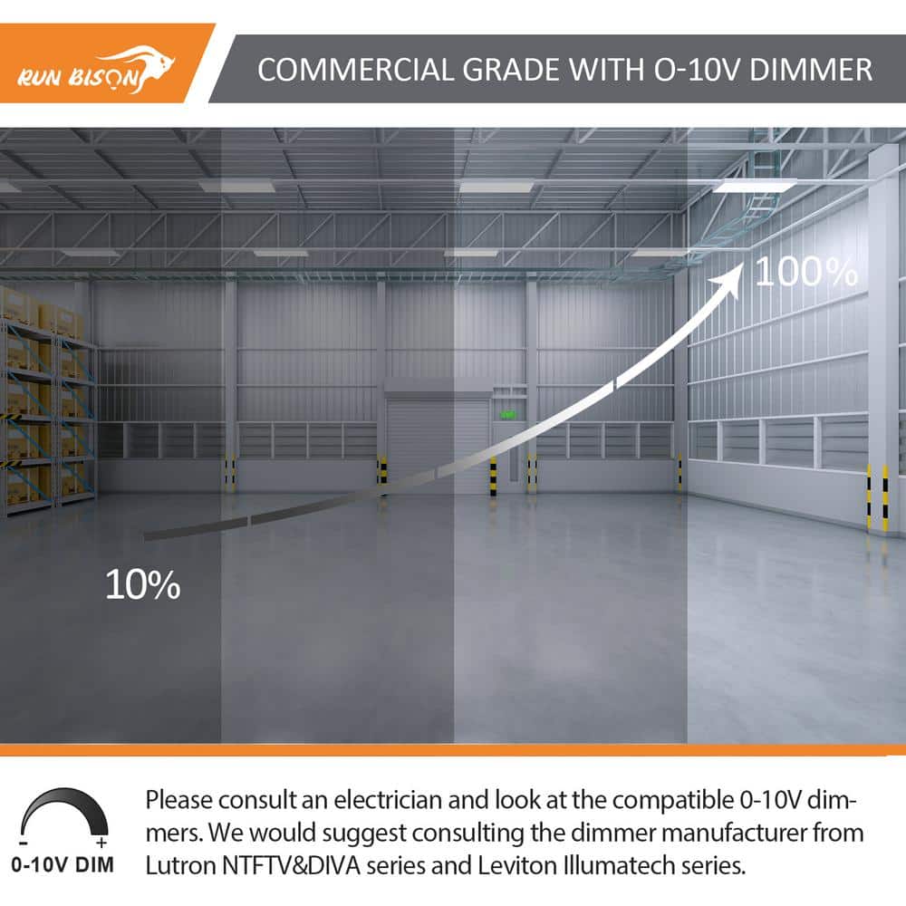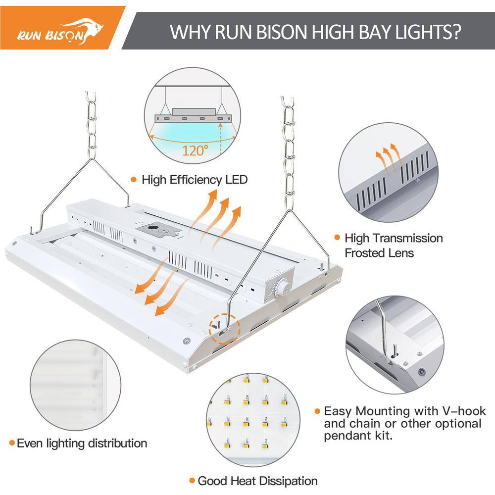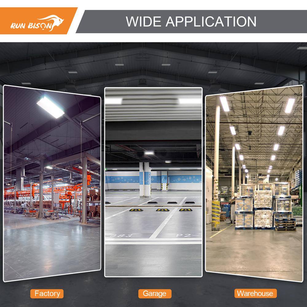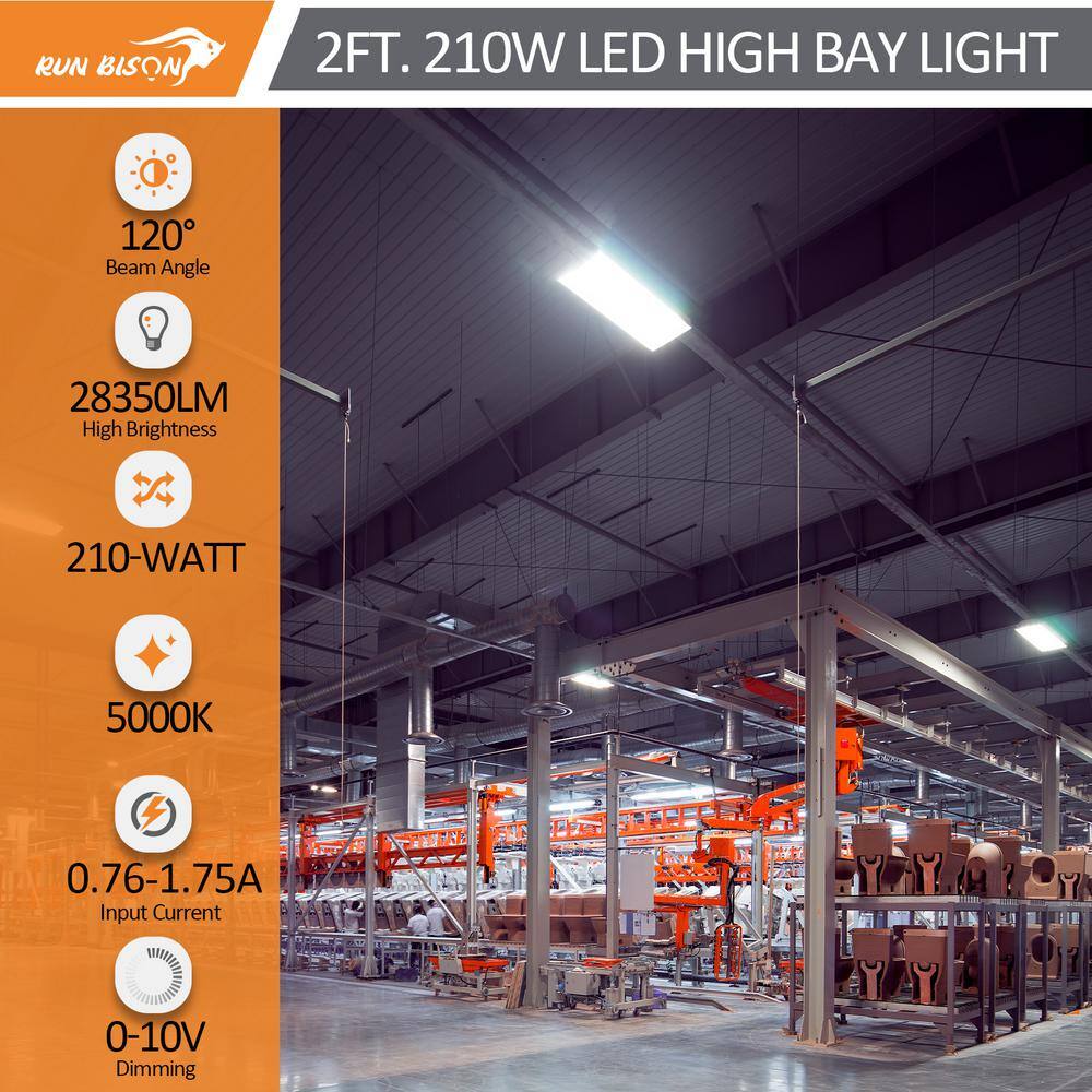Illuminate vast spaces efficiently with the RUN BISON 2 ft. 800-Watt Equivalent Integrated LED Dimmable High Bay Light. Designed for expansive facilities like warehouses and gyms, these fixtures deliver superior brightness and energy savings of over 60%. With a lifespan exceeding 50,000 hours, they are ideal for both new constructions and retrofits.