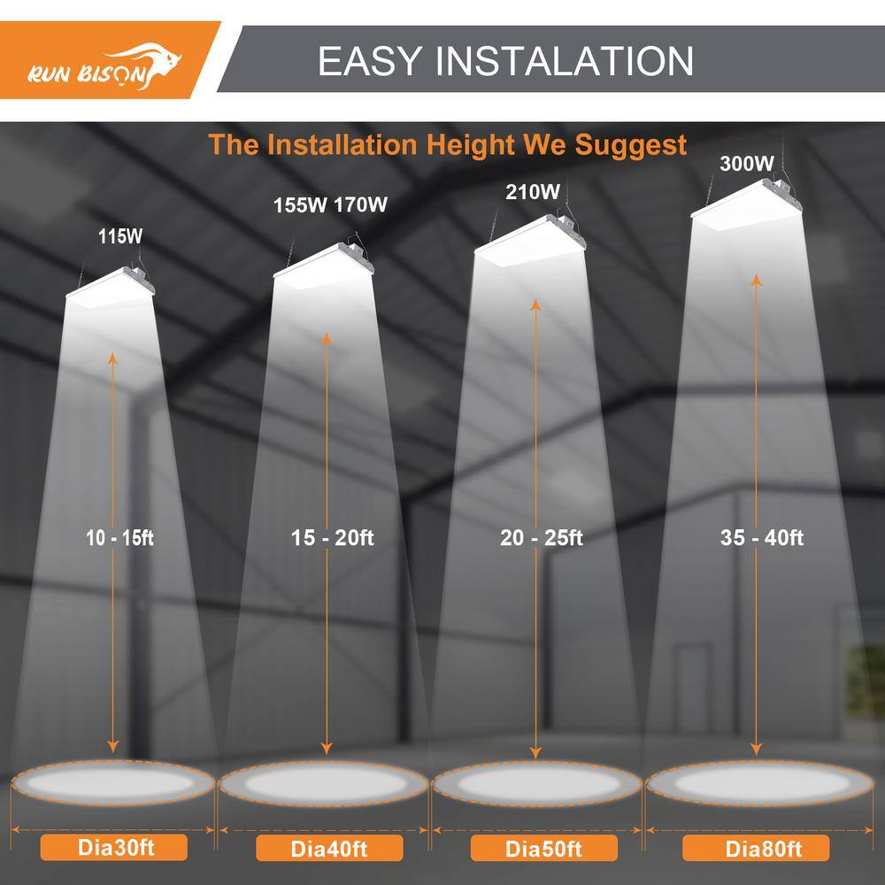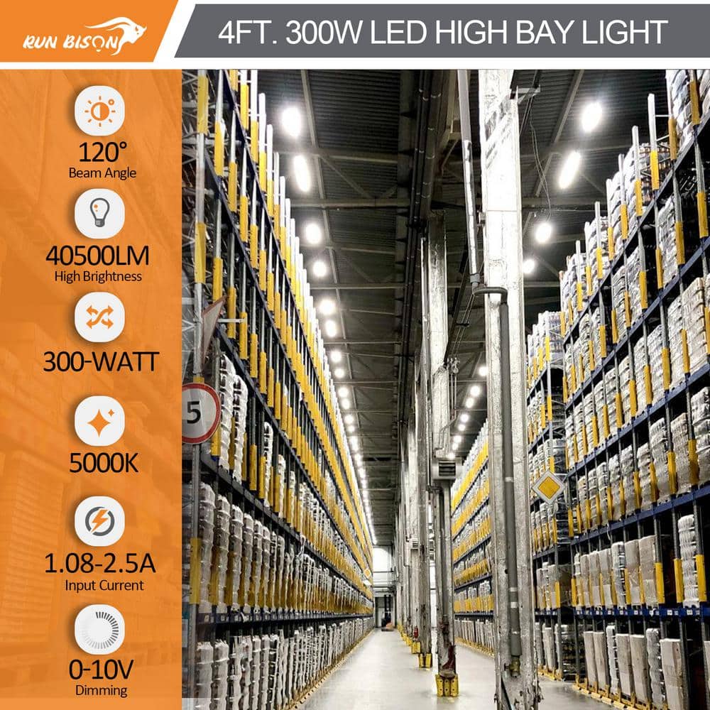 Illuminate your large spaces with the RUN BISON 4 ft. Integrated LED Dimmable High Bay Light. Offering 40,500 lumens with a crisp daylight color temperature, this 300-watt light efficiently lights up commercial and industrial settings. Say goodbye to excessive energy bills and hello to sustainable lighting with over 60% energy savings and a long lifespan certified for up to 50,000 hours.