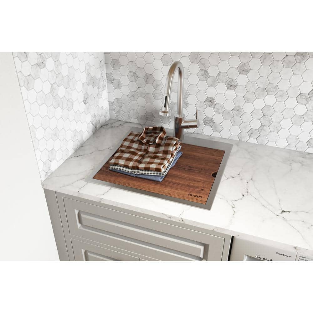 Step into a world where functionality meets polished elegance with the Ruvati Alto Utility Sink. This stainless steel masterpiece transforms mundane chores into moments of sophistication, accentuated by its striking commercial-grade finish. The built-in wooden washboard isn't just practical—it's a tactile work of art. Place it in a laundry room to add utilitarian charm and unmatched functionality. This sink, with its sleek lines and robust form, is the hallmark of refined, luxurious living.