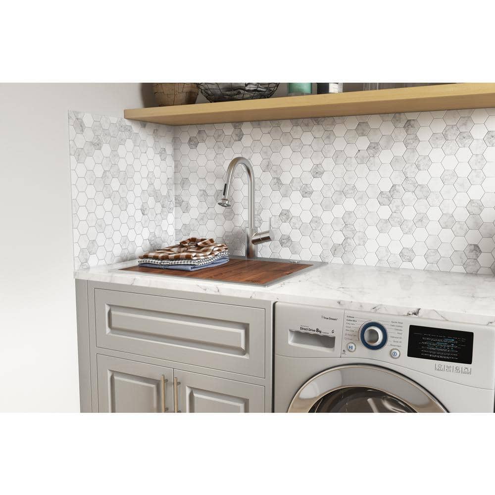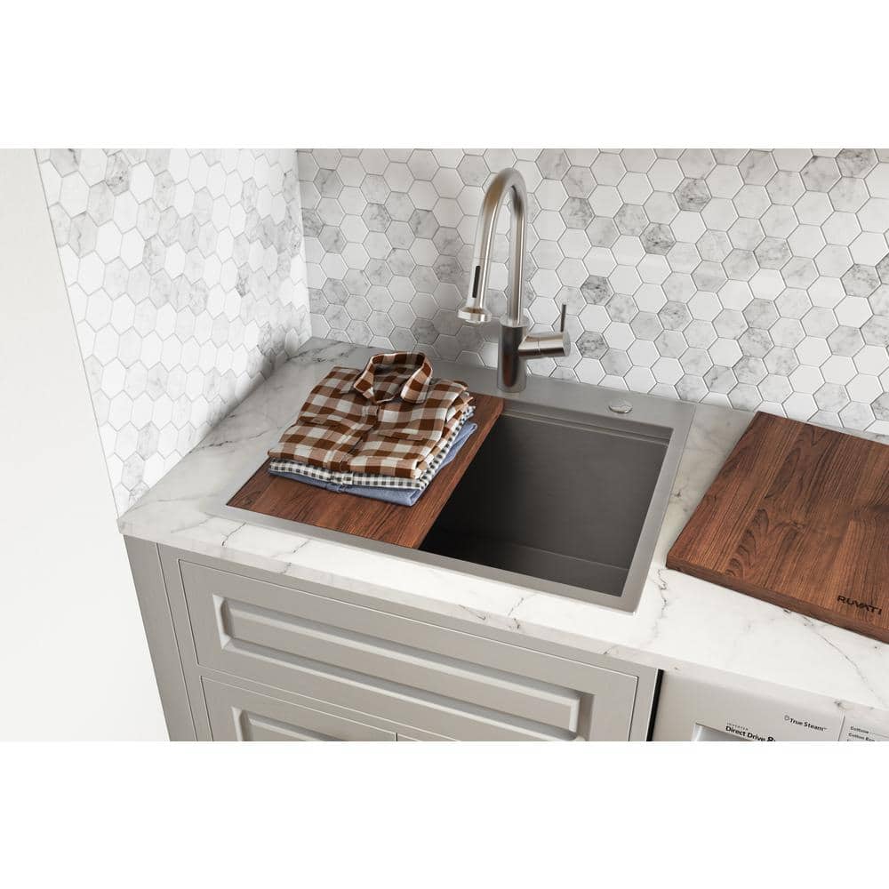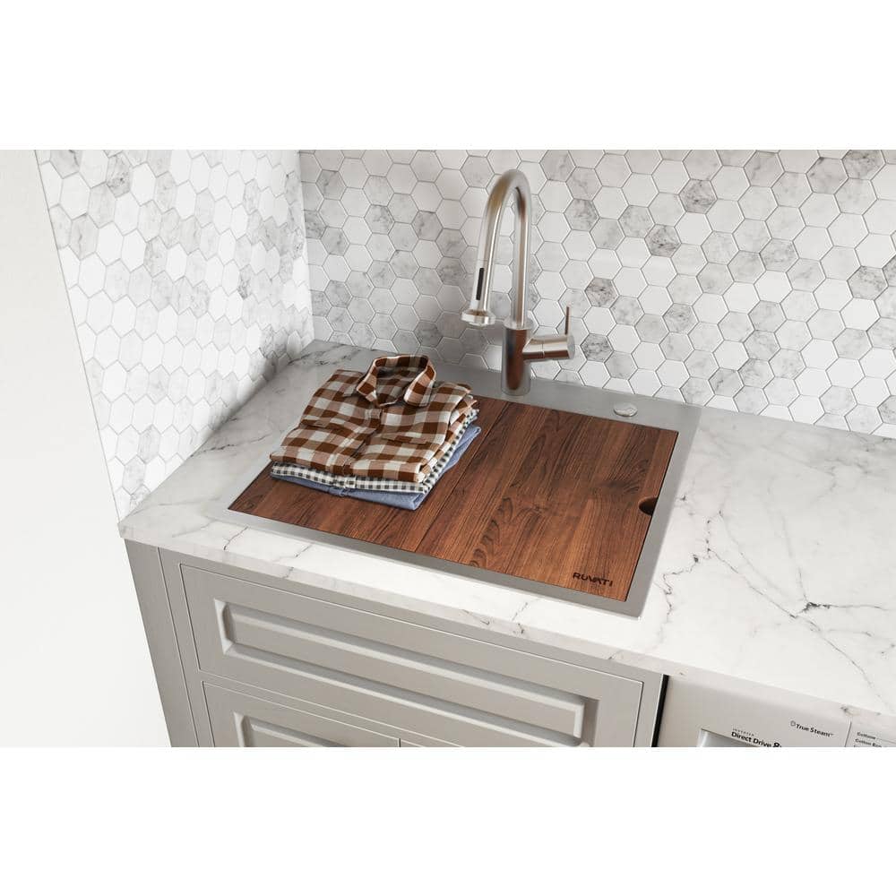 The Ruvati Alto Workstation Sink elevates your laundry or utility space with a deep, durable stainless steel basin and integrated workstation features. Designed for efficiency, it comes with a custom solid hardwood washboard and a protective stainless steel grid to enhance functionality while maintaining a sleek aesthetic. Capture the perfect blend of style and utility in your laundry room with this versatile sink.