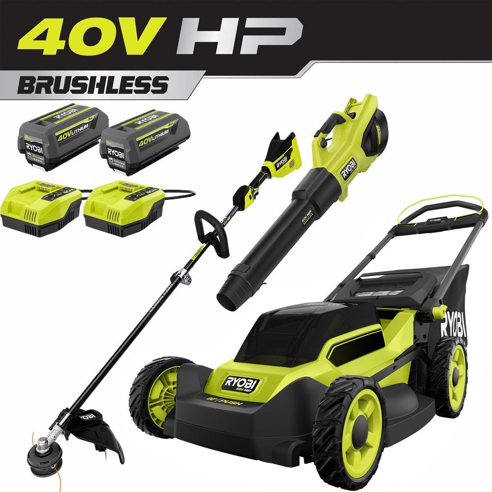 Achieve gas-like performance with the RYOBI 40V HP Brushless Mower Kit, featuring a 20-inch cordless push mower, a string trimmer, and a whisper-quiet blower. This battery-powered set combines durability with convenience, offering 3-in-1 mowing functions and attachment-capable versatility perfect for any professional landscape project or DIY garden care.