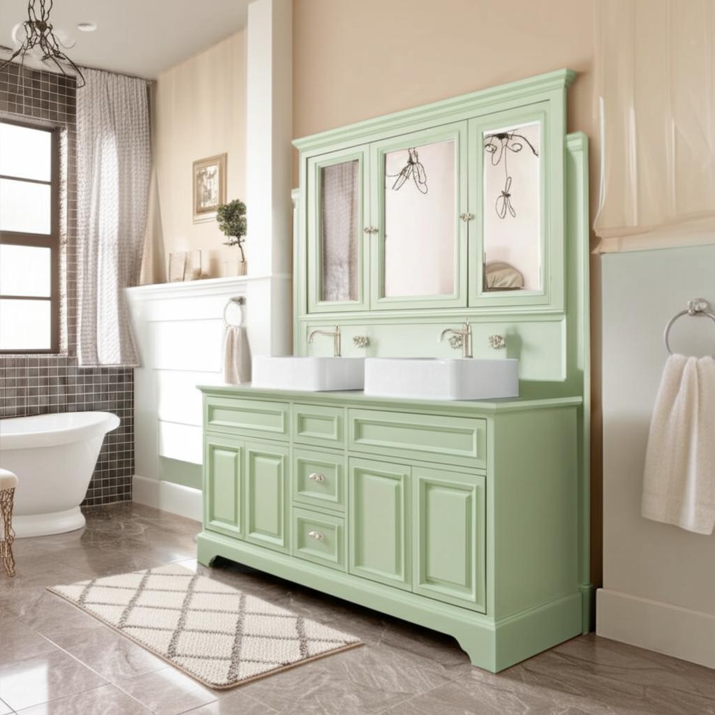 Elevate your bathroom with the Sadie Double Sink Vanity, a masterpiece of transitional design. Its light cyan finish and natural marble top create a serene and sophisticated ambiance, while the soft-close drawers and nickel hardware add a touch of luxury. Style it with plush towels and a vase of fresh flowers to complete the look. This vanity is not just a functional piece but a statement of refined taste.