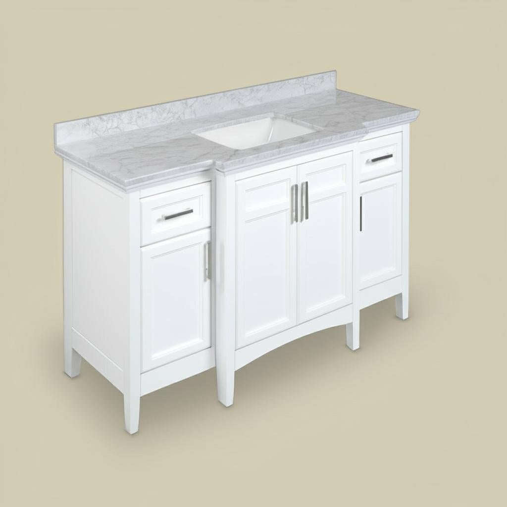The Sassy 42" Single Sink Vanity combines transitional design with practical functionality. Featuring a Carrara marble top and brushed nickel hardware, it offers ample storage and a pre-attached ceramic sink for convenience.