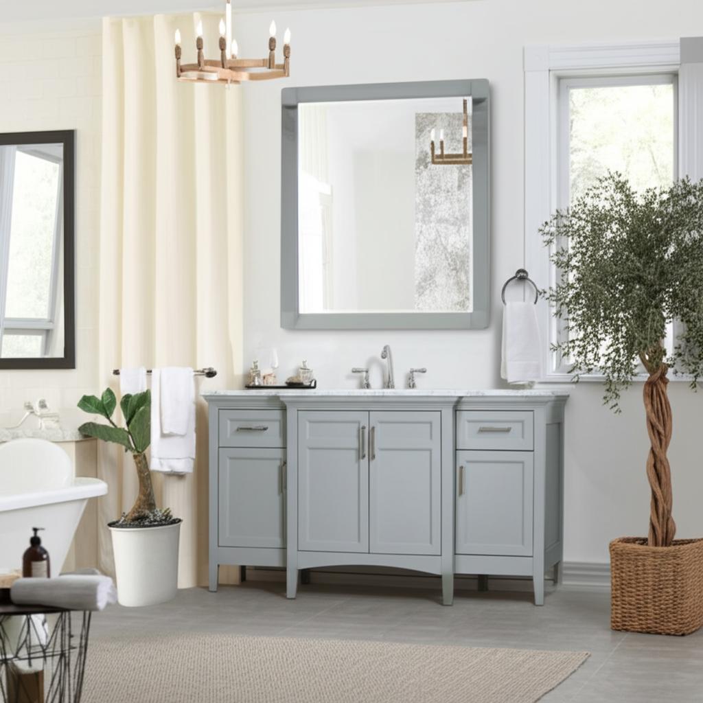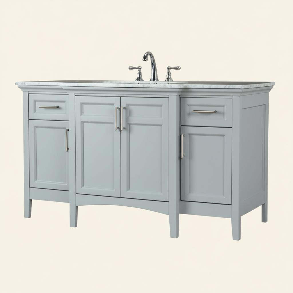 The Sassy 60" Dove Gray Vanity combines modern design with practical functionality, featuring a Carrara marble top and ample storage. Perfect for enhancing any bathroom space.