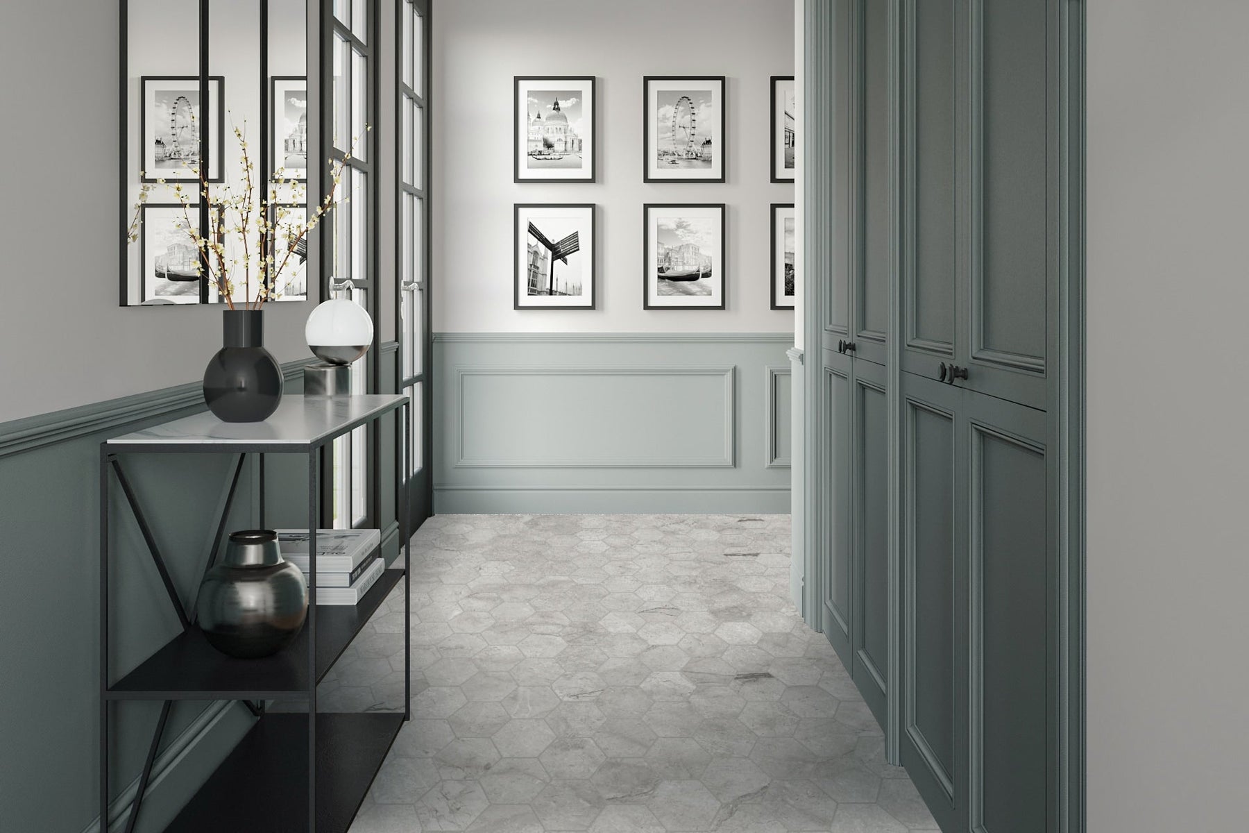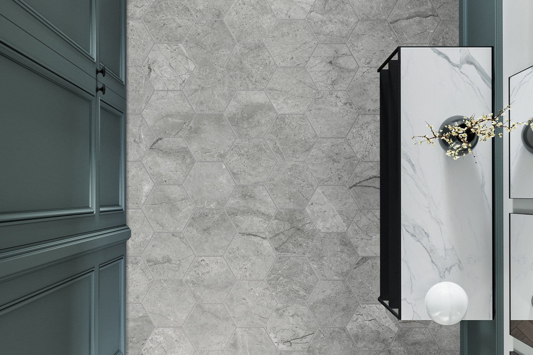 Transform your space with the Satori Regent Argento Hexagon Tile, an elegant matte porcelain option designed for both floors and walls. Its sophisticated stone look brings timeless charm, while the unique hexagonal shape adds visual interest to any room. Ideal for medium to heavy traffic areas, this tile is durable and resistant to scratches and fading.