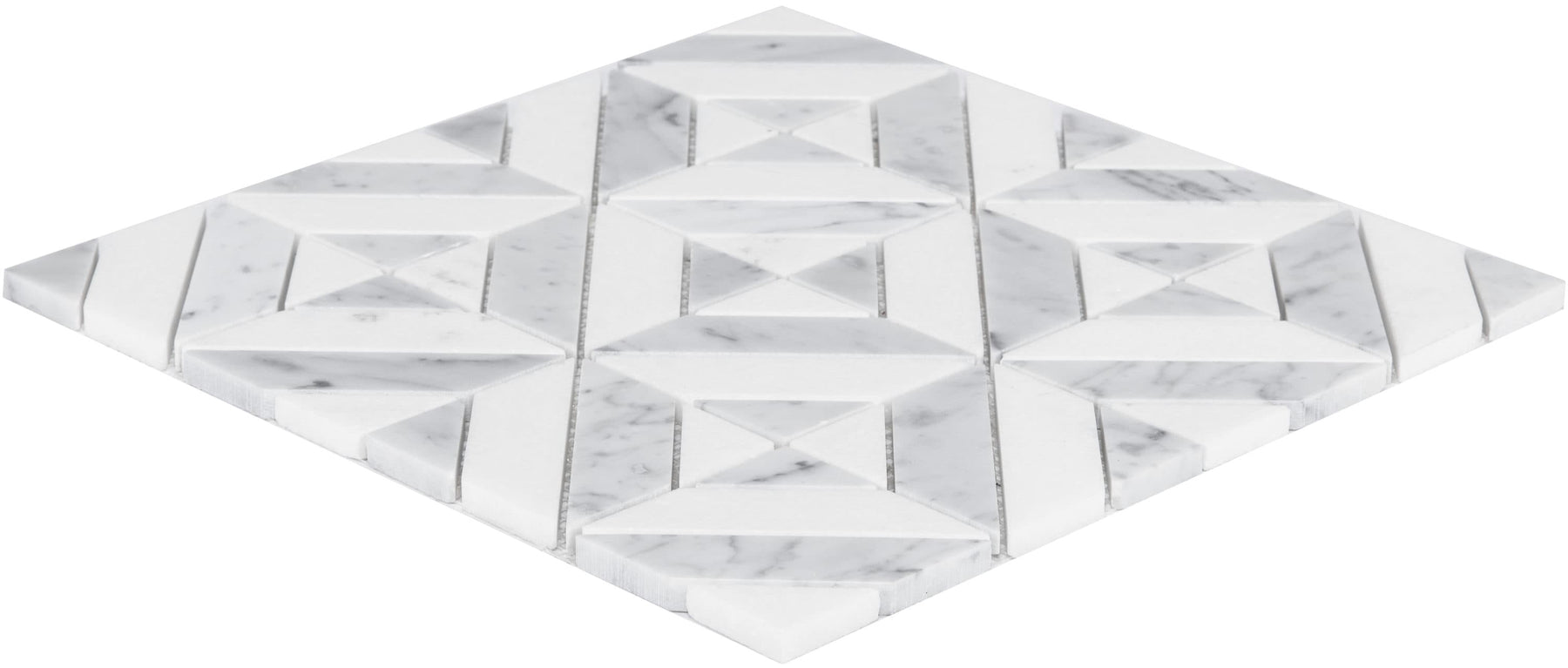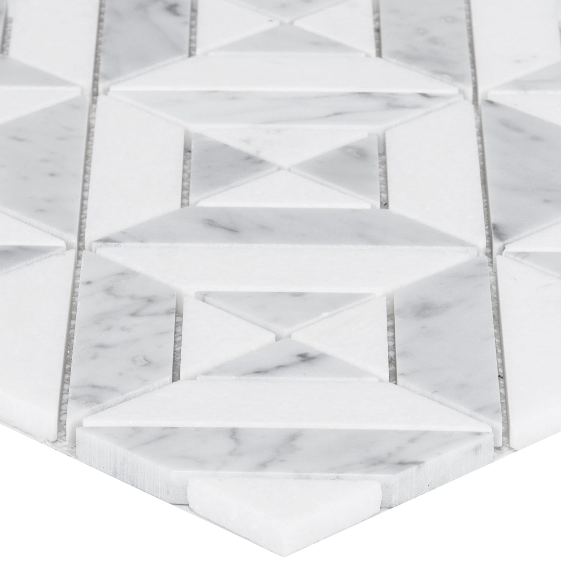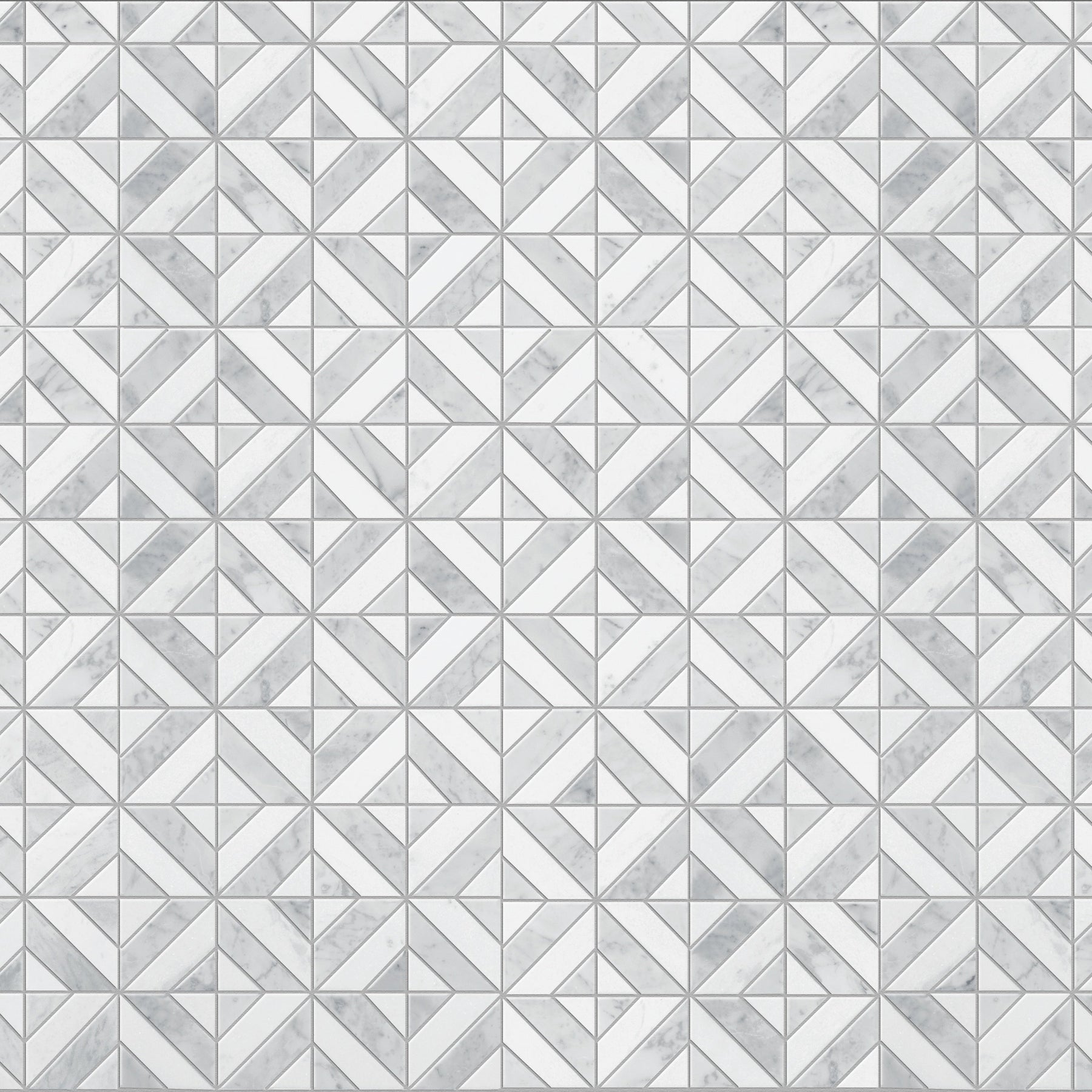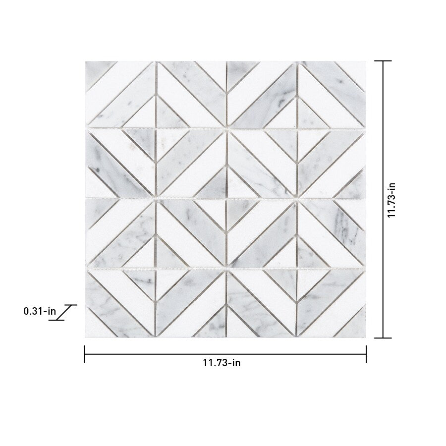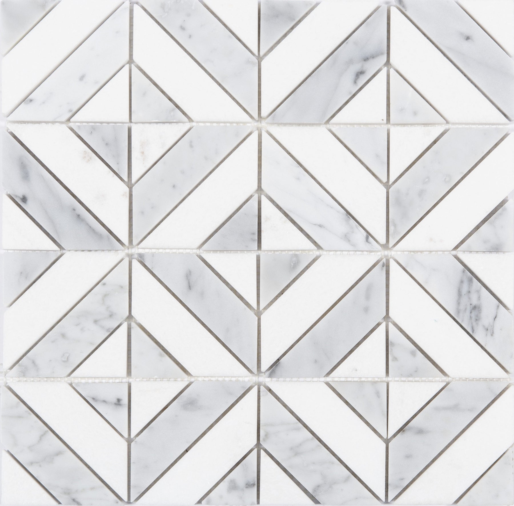 Transform any space with the Satori Venatino Parquet Mosaic Tile, a polished natural stone tile that mimics luxurious marble. Its striking white and gray chevron pattern makes for a sophisticated addition to kitchens, bathrooms, and accent walls. Built for durability, these tiles are ideal for medium to heavy traffic areas while offering a seamless look with their rectified edges.