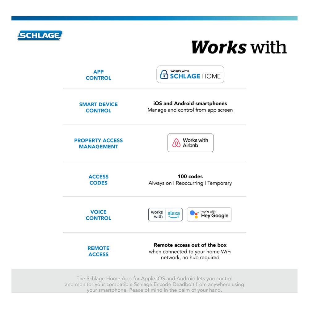 WiFi Connectivity: Control your lock from anywhere with the Schlage Home app.