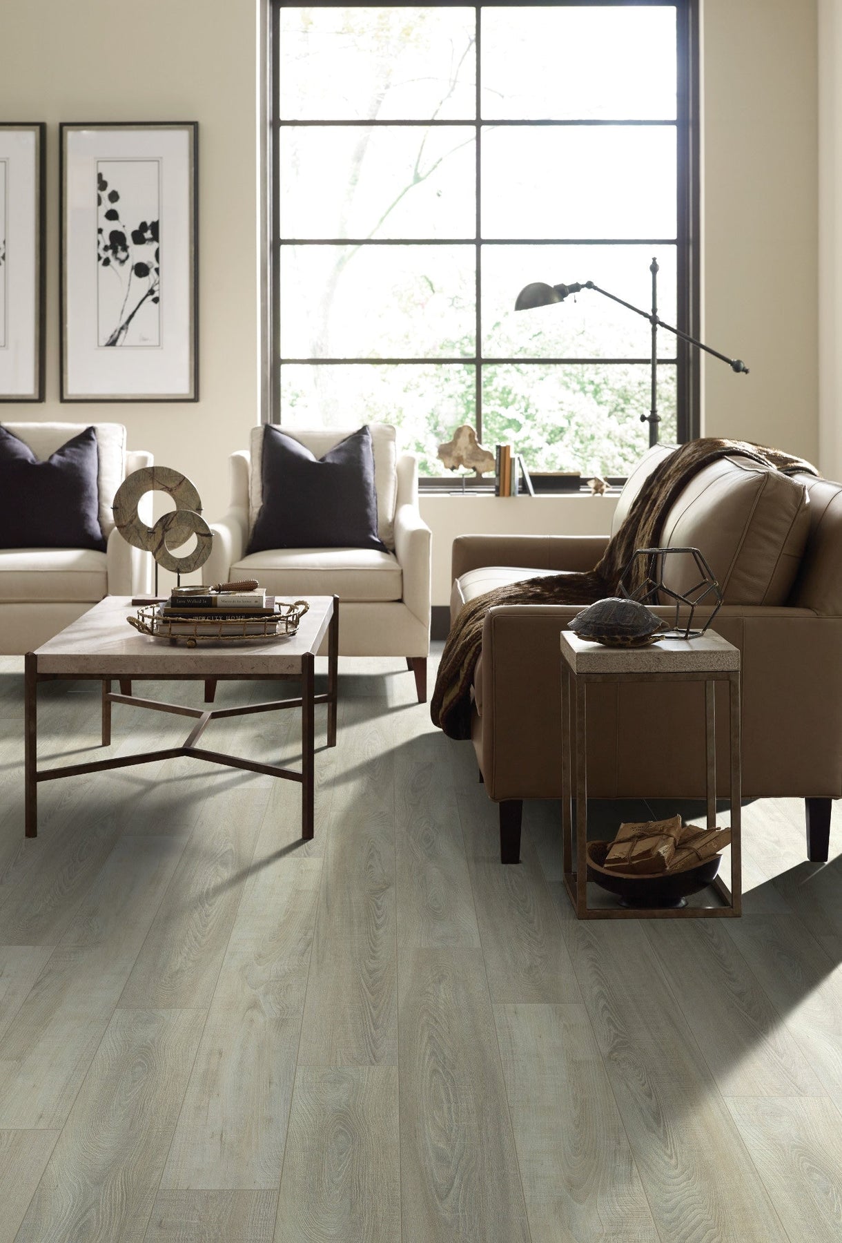The Shaw Parallax HD Plus Exquisite Gray flooring adds a layer of sophistication with its captivating fusion of textures and tones, echoing the timeless elegance of reclaimed wood. Its exceptional durability and waterproof design speak to both style and function, making it a perfect choice for any designer's vision. Imagine this exquisite flooring gracing a light-filled living area, where every step is cushioned by its acoustical pad. It's an effortless blend of beauty and practicality, redefining luxury in the modern home experience.