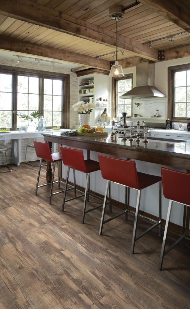 Elevate your interiors with the unyielding charm of Shaw's Perennial Spur Brown vinyl planks. Their striking, rustic wood visuals create a warm, inviting ambiance that feels both luxurious and unpretentious. Use them to add character to your spaces, crafting floor patterns that defy the ordinary. Not only are these floors a feast for the eyes, but their waterproof nature makes them perfect for stylish, worry-free living.