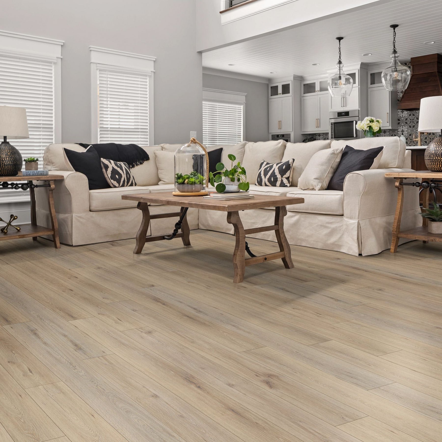 Shaw's Tundra Plus Vinyl Plank transforms any room into a peaceful retreat with its authentic wood appearance and soothing Wild Sands color. The texture of the planks adds depth and elegance, making it an ideal choice for open living spaces. Consider pairing these planks with light, soft furnishings to enhance their natural glow and create an inviting ambiance. Elevate the aesthetic of your home with this luxurious yet practical flooring choice, where beauty meets resilience.