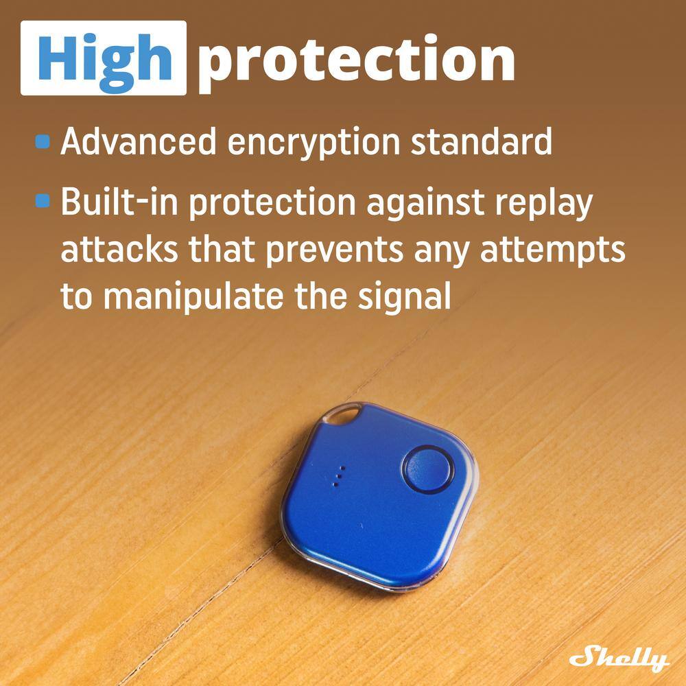 A: The Shelly BLU Button1 uses AES encryption, a standard ensuring that all data transmitted is secure and protected against unauthorized access.