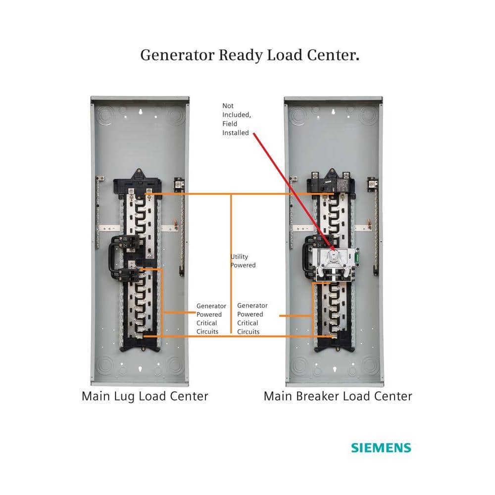 Efficiently prepare for future power outages with the Siemens 225 Amp Generator Ready Load Center. This innovative electrical panel minimizes future generator installation costs by integrating generator-ready capabilities, providing two separate interiors for standard and generator backup operation.