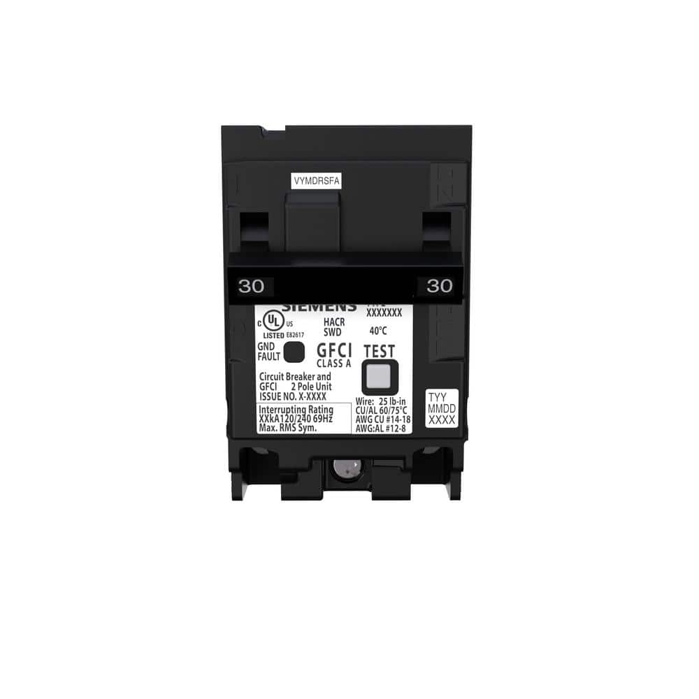 Ensure superior safety with the Siemens 30 Amp 2-Pole GFCI Plug-On Neutral Circuit Breaker. This breaker provides reliable Class A GFCI protection, ideal for wet and damp indoor locations. Featuring a Self-Test and Lockout mechanism, it assures continuous monitoring for utmost safety.