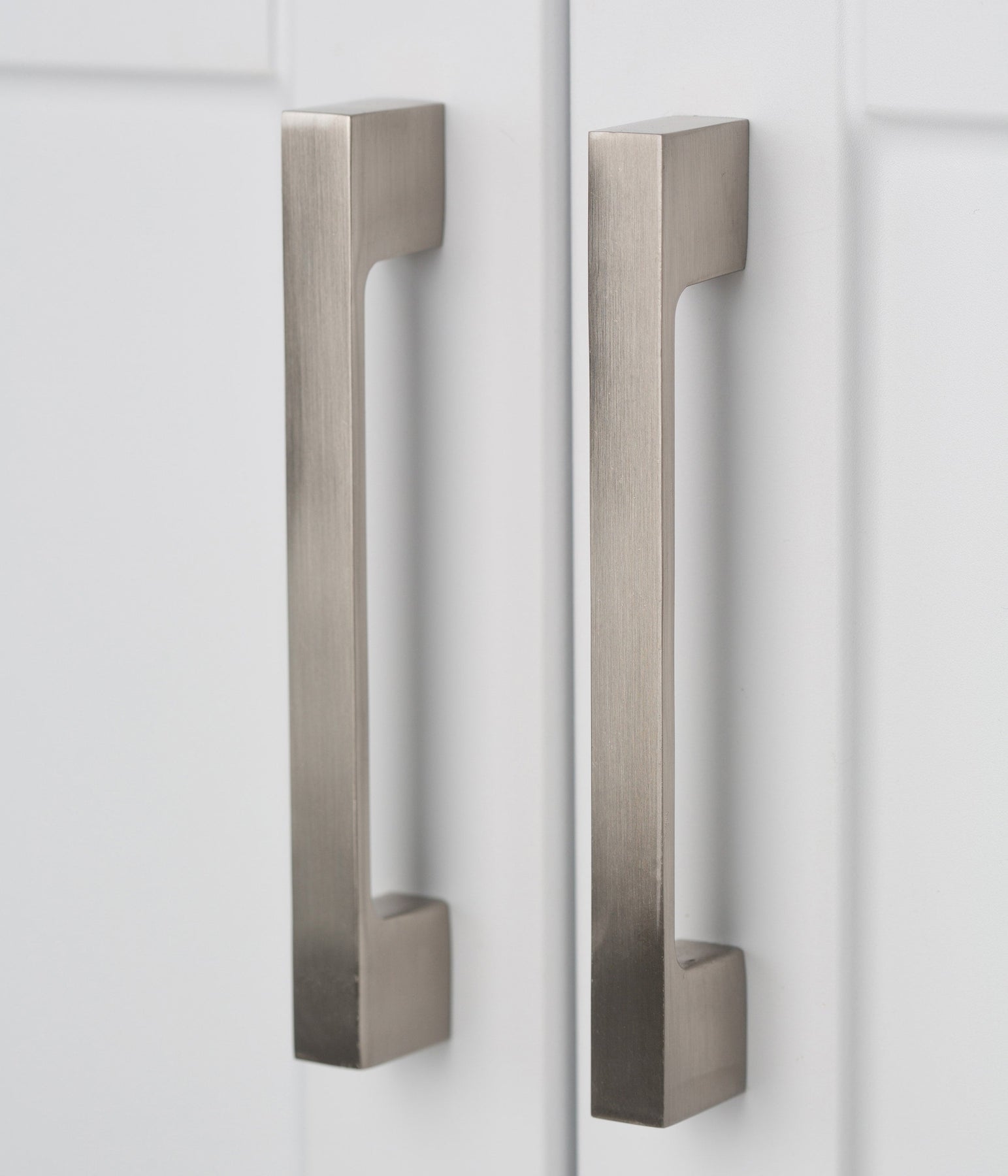 Sleek and Modern: Pure white finish with brushed nickel door pulls elevates the aesthetics of any laundry room.