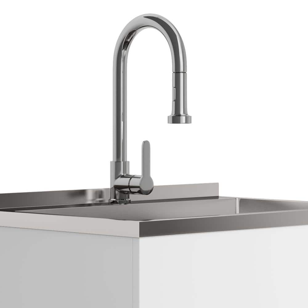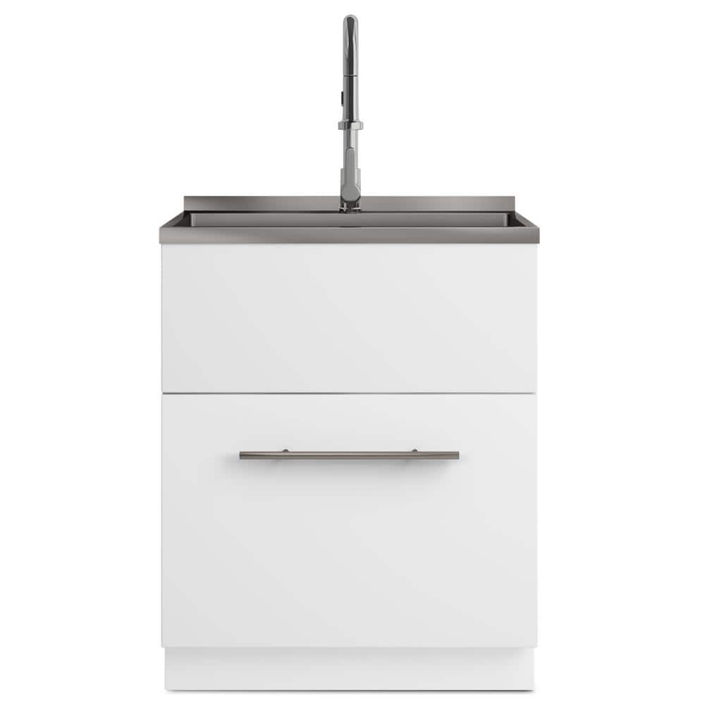 Envision the Metro Modern Laundry Sink as the perfect fusion of utility and style, seamlessly transforming any laundry room into a space of sophisticated charm. With its sleek chrome faucet and polished stainless steel basin set against the pristine white façade, this piece exudes contemporary elegance. Imagine using the spacious drawer to neatly conceal your essentials, keeping your space clutter-free and serene. Truly, this sink cabinet is not only a functional necessity but an exquisite centerpiece in any luxe laundry setting.
