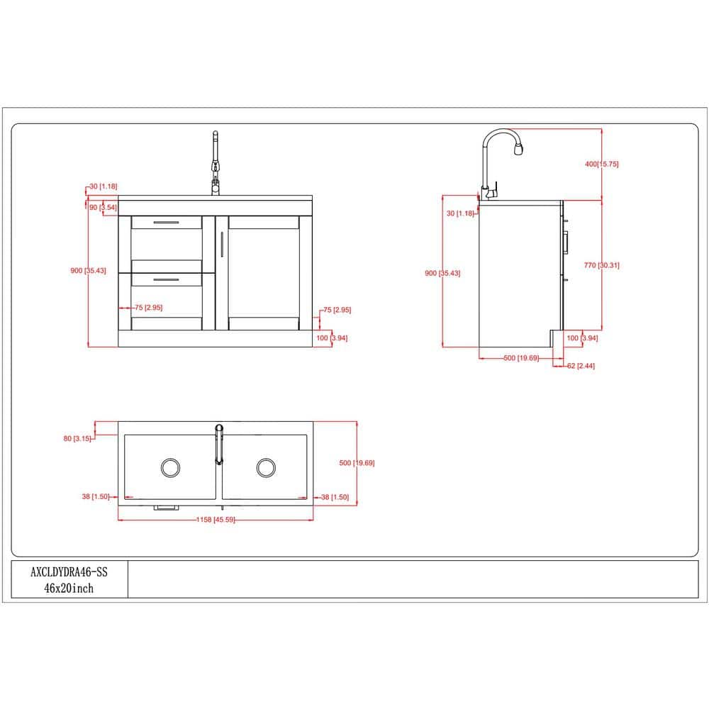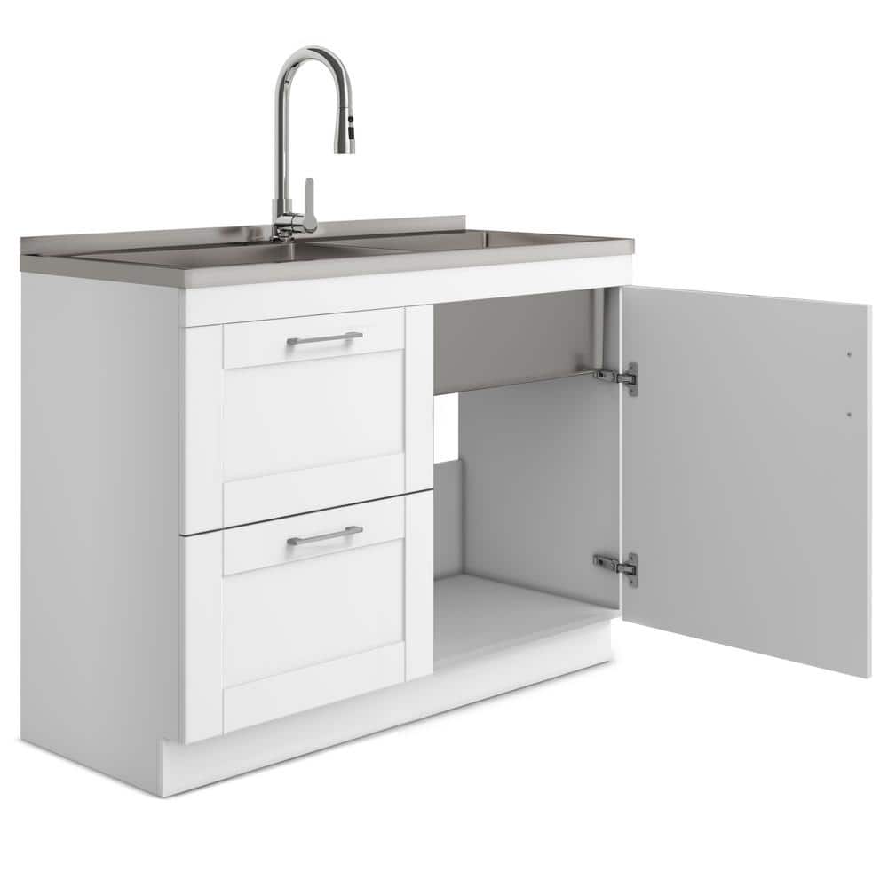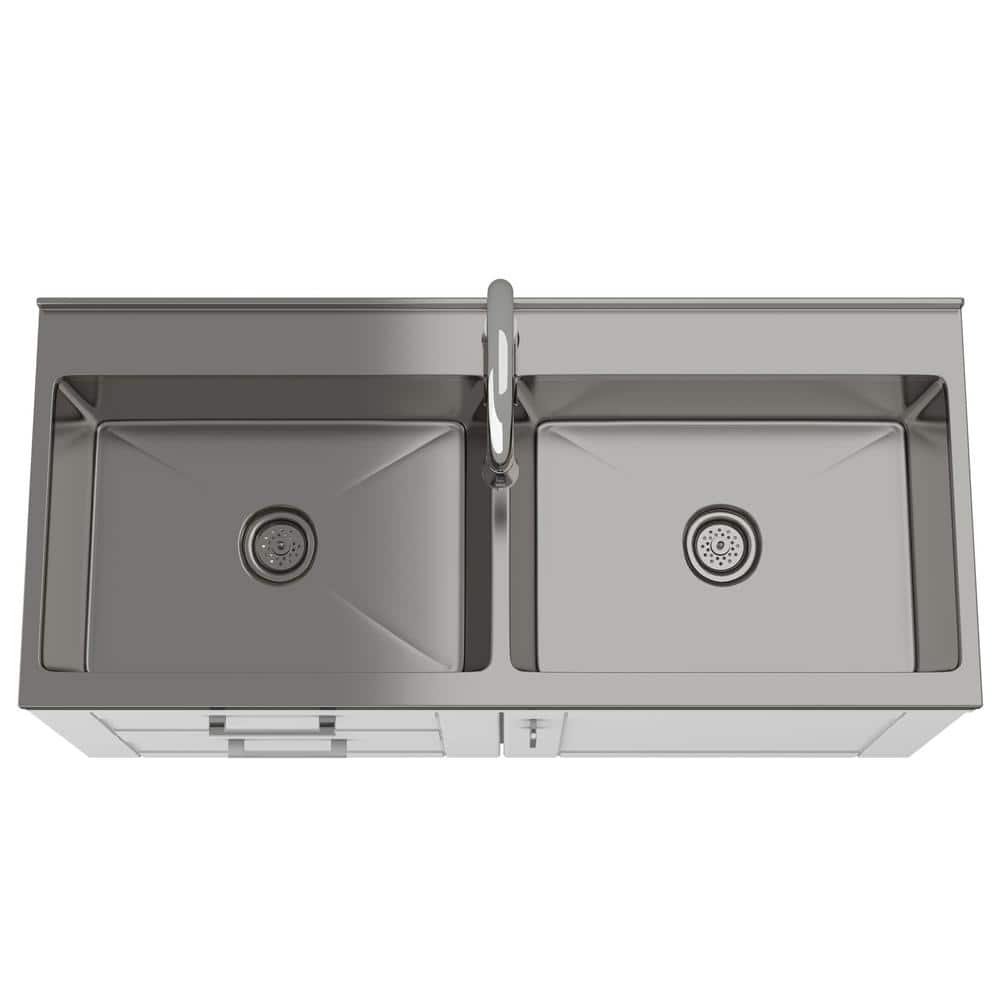 A: The cabinet is 46" wide, 34.25" high, and 19.7" deep, with a 10-inch deep stainless steel sink.