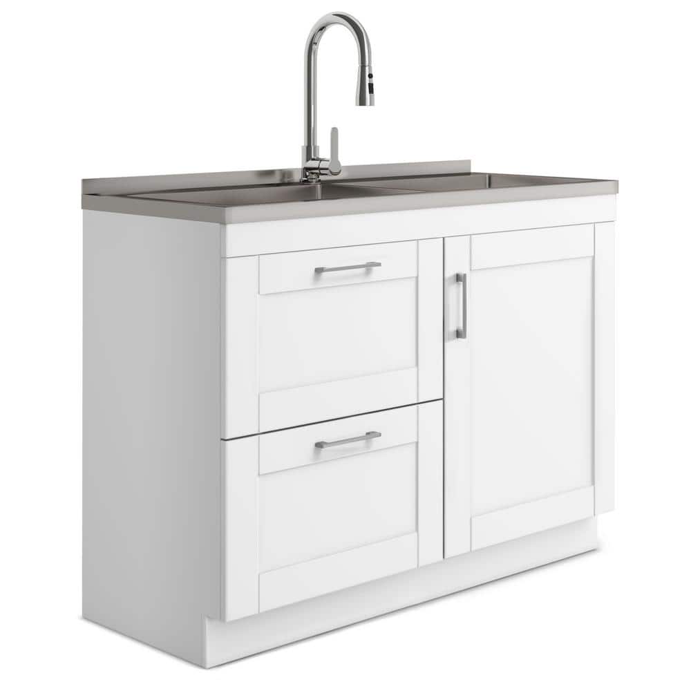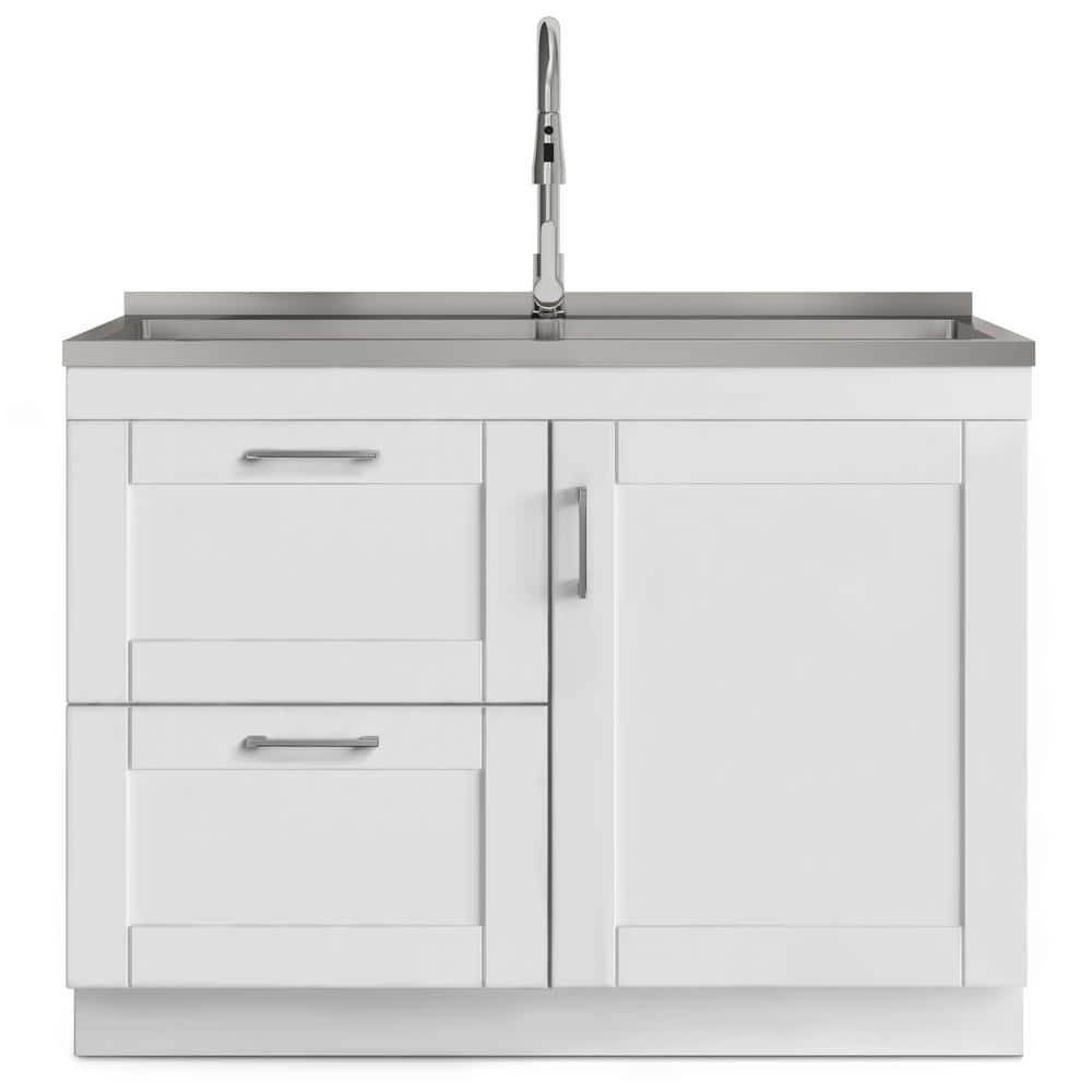Upgrade your laundry room with Simpli Home's 46" wall-mounted laundry sink and cabinet combo. Featuring contemporary shaker doors, a stainless steel sink, and a high arc faucet, it's the perfect blend of style and function. With ample storage and premium materials, this unit is designed to meet all your organizational and laundry needs.