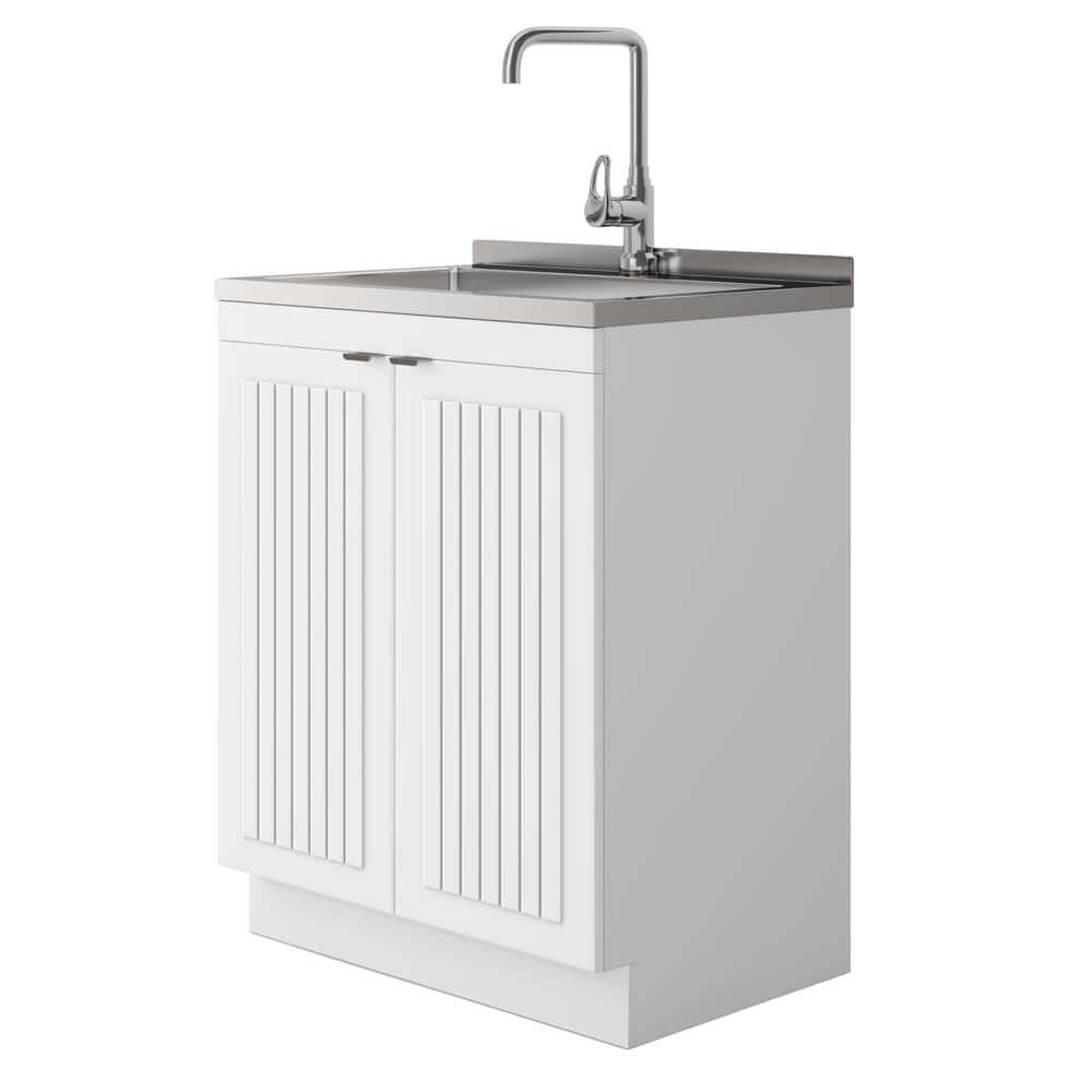 Simpli Home Murphy Transitional 28 in. wall mount Laundry sink with Cabinet Faucet and Stainless Steel Sink in White