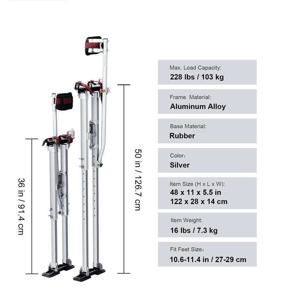 Experience unmatched stability and comfort with SKYSHALO's Adjustable Aluminum Drywall Stilts. These high-strength stilts feature a fully adjustable height range of 36 to 50 inches, providing a reliable solution for drywall installation, painting, and other elevated tasks. Made from robust aluminum alloy and equipped with shock-absorbing springs, these stilts ensure durability and ease of use.