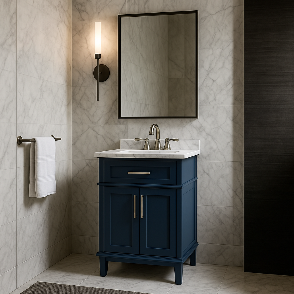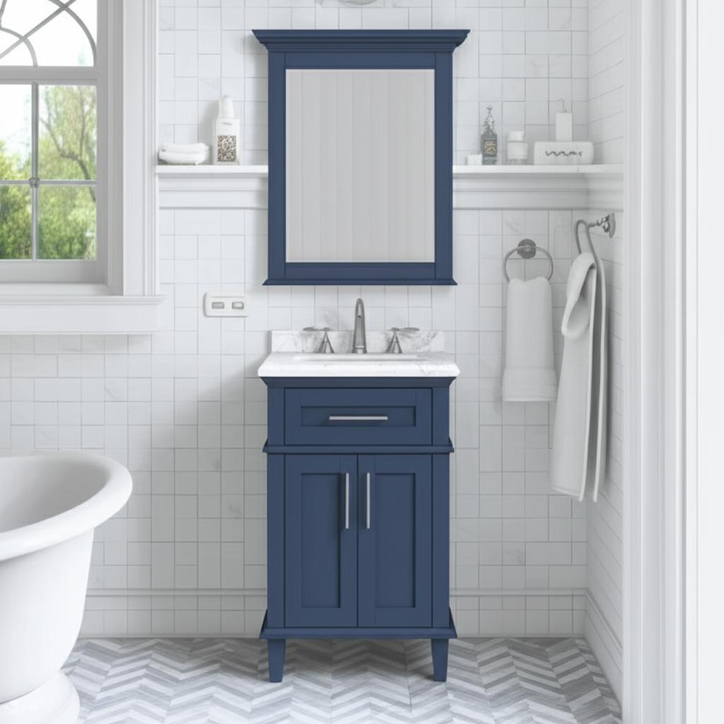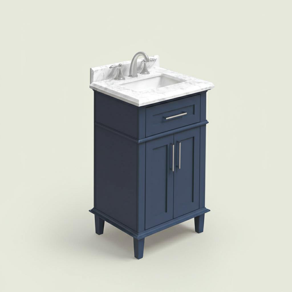 The Sonoma 24-inch Midnight Blue Vanity combines modern design with practical features, including a Carrara Marble countertop, soft-close doors, and ample storage space. Perfect for enhancing any bathroom's aesthetic.