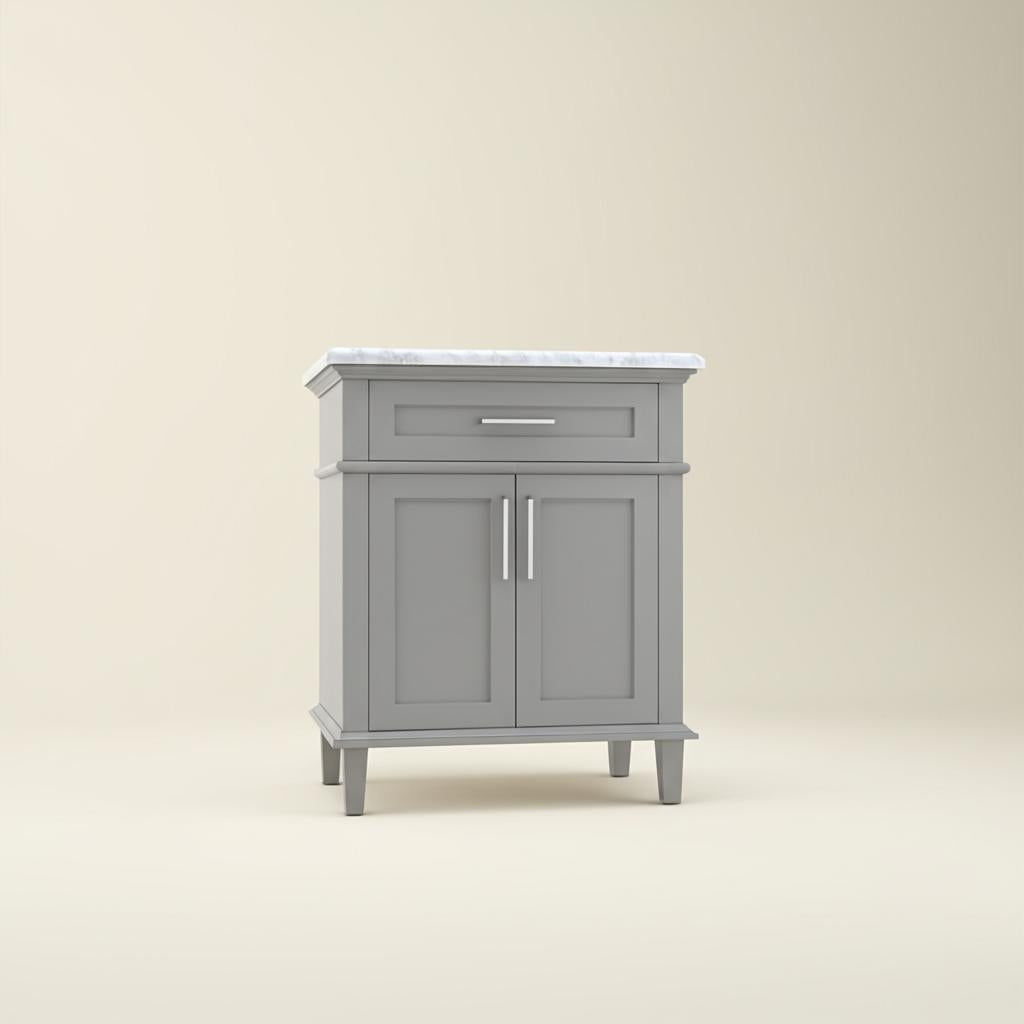 Transform your bathroom into a sanctuary of style with the Sonoma 30-inch vanity. Its Pebble Gray finish and Carrara Marble countertop exude timeless elegance, while the soft-close doors and adjustable shelf offer practical storage solutions. Pair it with chrome fixtures and a matching mirror to create a cohesive and luxurious space. This vanity is the epitome of refined design and functionality, making it a must-have for any sophisticated home.