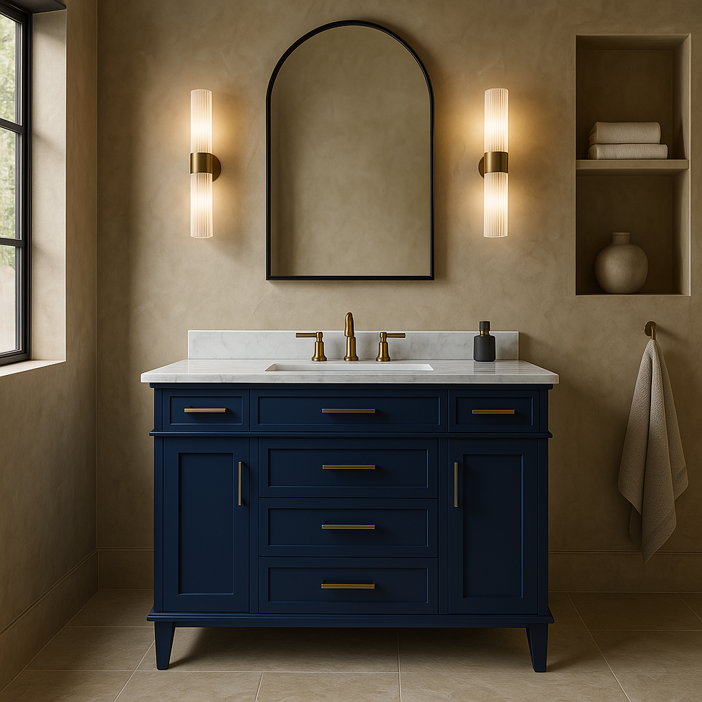 Transform your bathroom into a sanctuary of sophistication with the Sonoma 48-inch vanity. Its Midnight Blue finish and Carrara Marble top exude timeless elegance, while the soft-close drawers and doors ensure a seamless experience. Pair it with chrome fixtures and a matching mirror to complete the look. This vanity is not just a piece of furniture; it's a statement of refined taste and luxurious living.