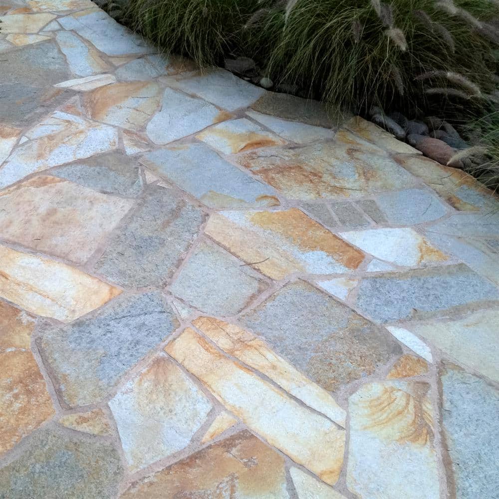 Create an alluring outdoor retreat with Klondike Gold Flagstone Pavers and elevate the elegance of your landscape today.
