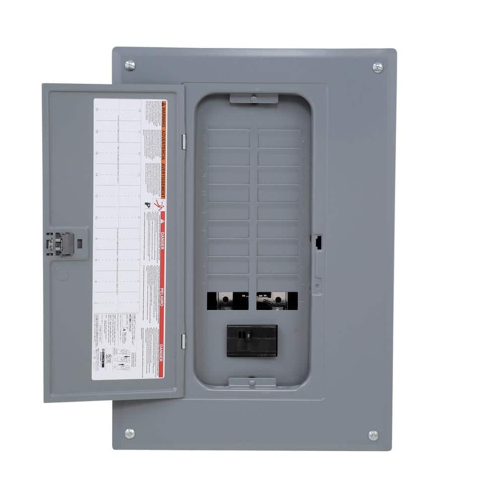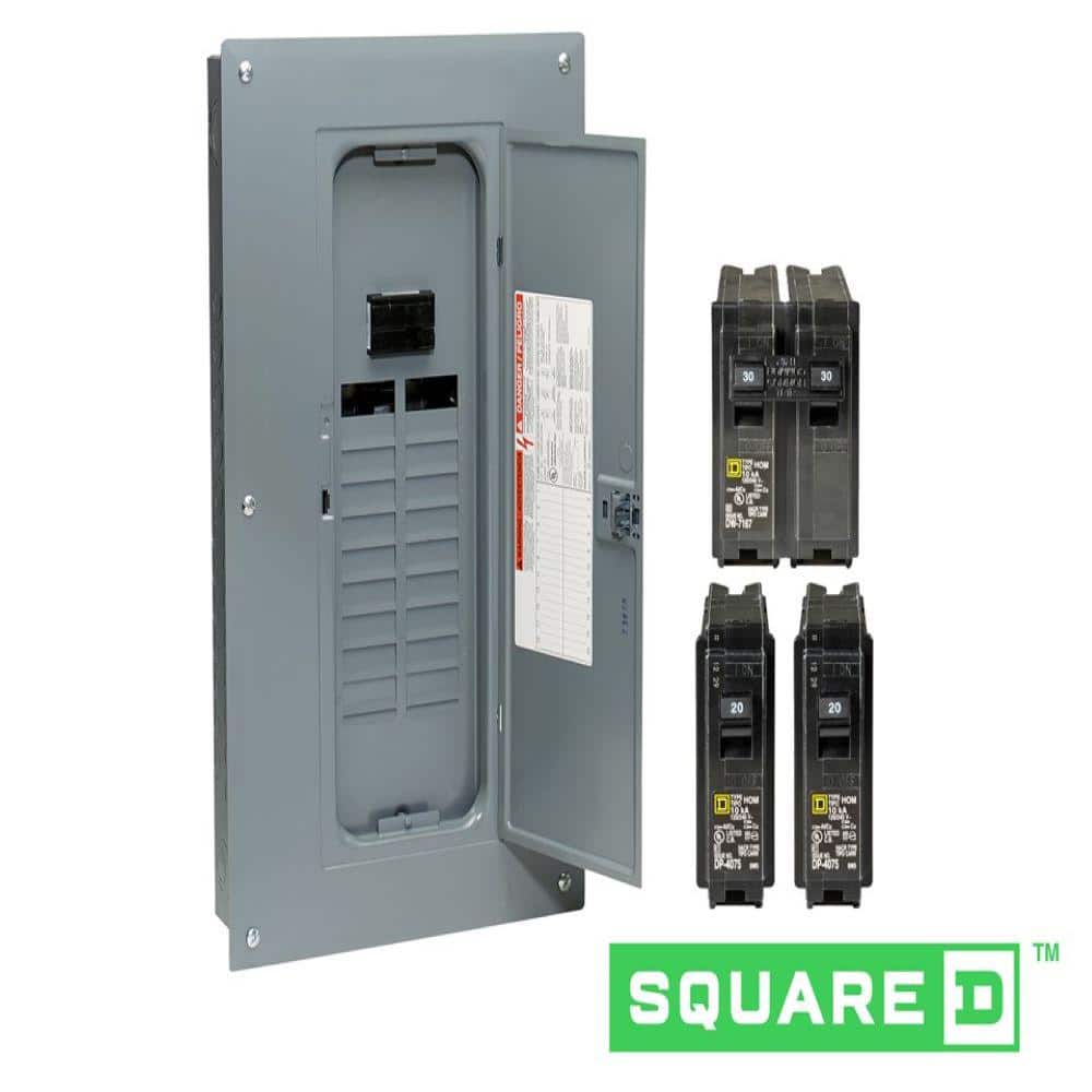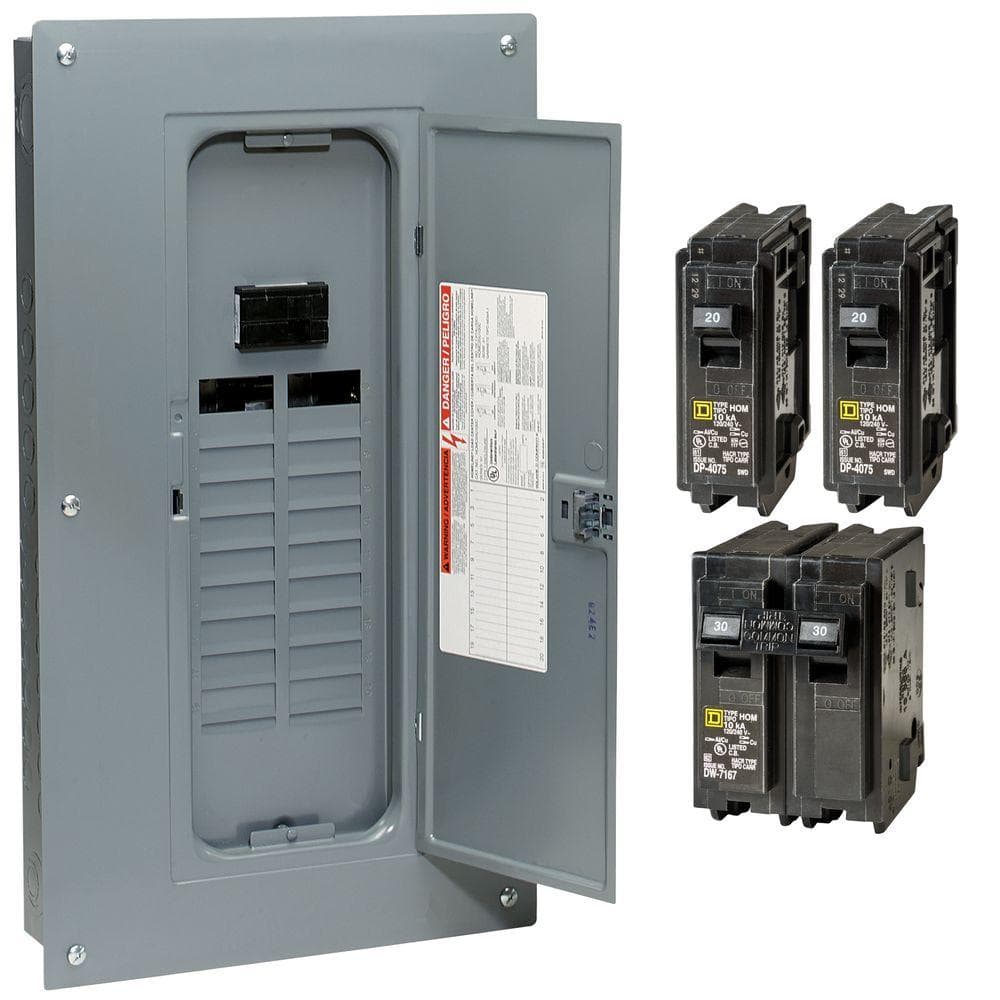 A: The Square D Homeline 100 Amp Main Breaker Load Center comes with two HOM120 20 Amp single-pole circuit breakers, one HOM230 30 Amp double-pole circuit breaker, and a combination flush/surface cover.