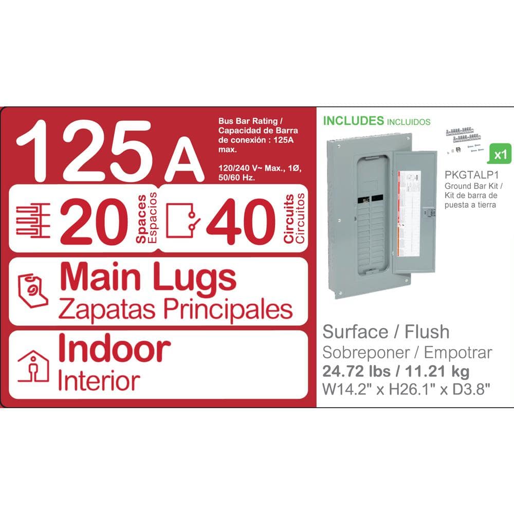 The Square D Homeline 125 Amp Main Lug Electrical Panel is designed for efficient power distribution in residential and commercial settings. With its easy plug-on neutral feature, it facilitates faster installation while minimizing wiring. This robust panel supports up to 20 spaces and 40 circuits, making it ideal for various electrical setups.