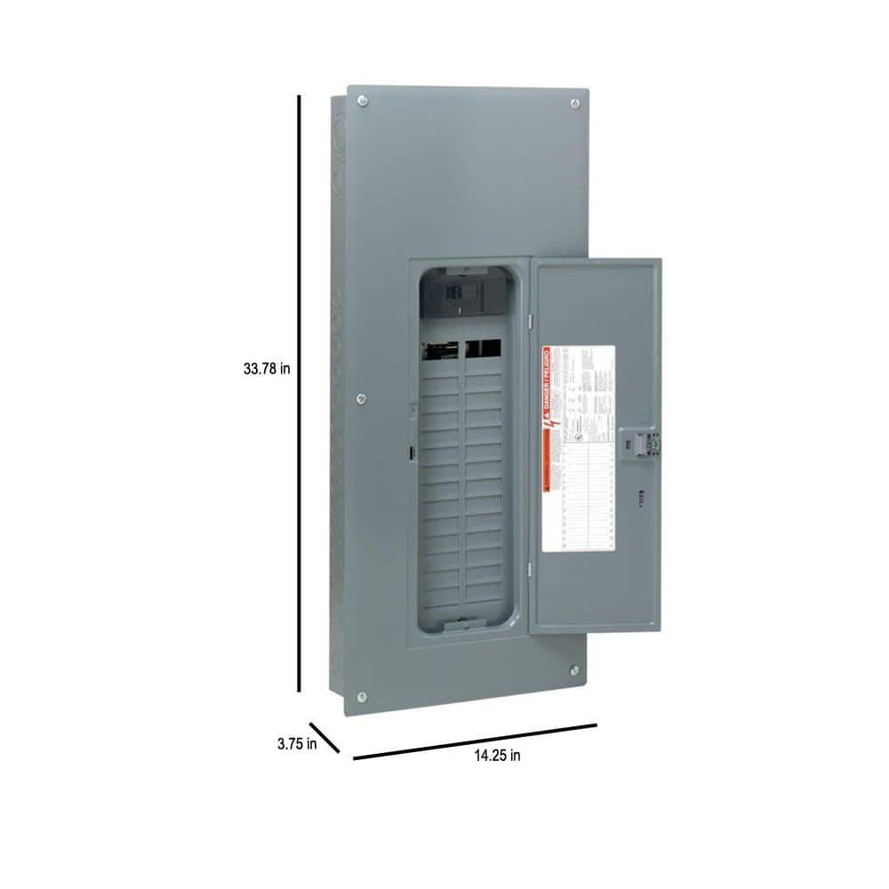 A: The load center measures 33.78 inches in height, 14.25 inches in width, and 3.75 inches in depth.