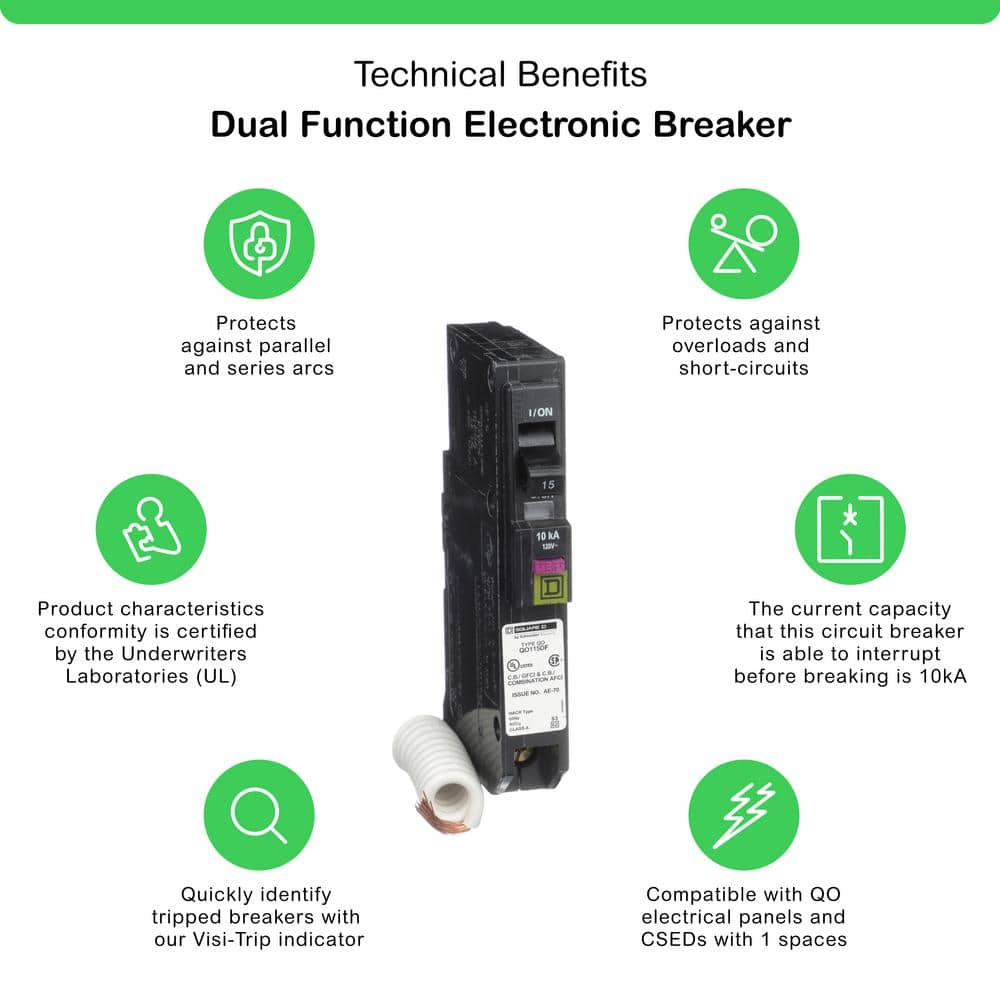 The Square D QO Dual Function Circuit Breaker offers both Arc Fault and Ground Fault protection in one compact device. With its easy installation into standard breaker boxes, this circuit breaker is a smart, cost-effective solution for modern kitchen or laundry room circuits, meeting current NEC standards effortlessly.