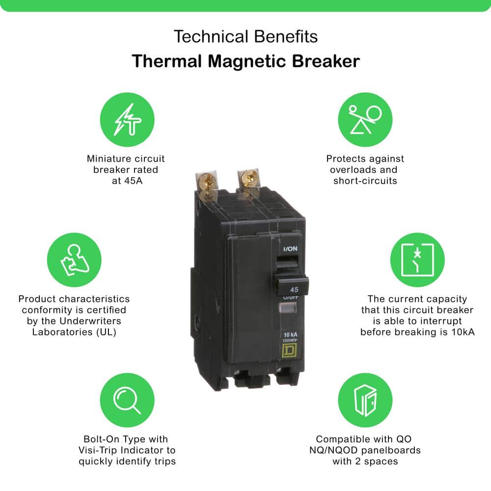 The Square D QO 45 Amp 2-Pole Circuit Breaker provides robust protection for your electrical systems against overloads and short circuits. Featuring a unique Visi-Trip indicator for immediate identification of a tripped breaker, this product ensures safety and reliability. Designed for easy bolt-on installation, it seamlessly integrates into existing systems, making it a trusted choice for both professionals and DIY enthusiasts.