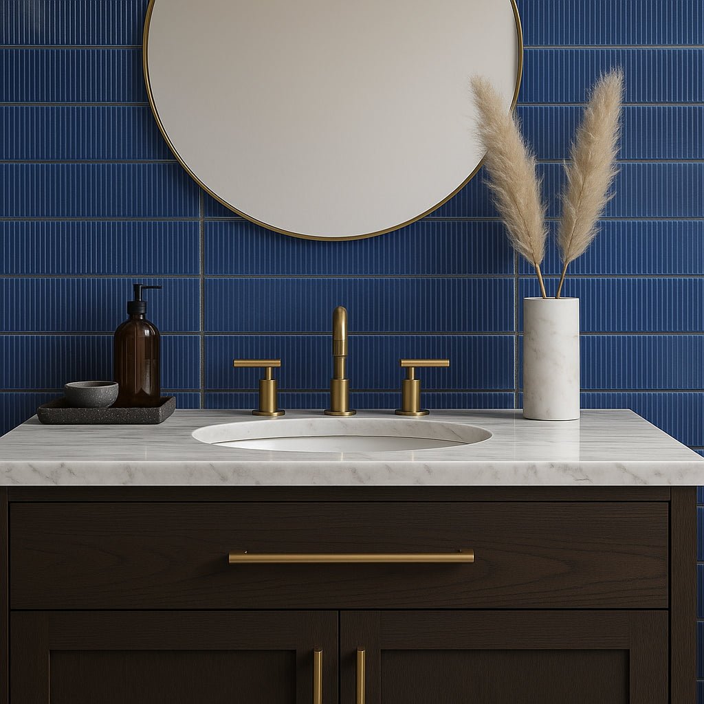 The Stacy Garcia ArtBlock Denim Blue 4x16 Fluted Glossy Porcelain Tile combines modern design with timeless elegance. Featuring a rich denim blue color and a textured 3D fluted surface, this tile is perfect for creating luxurious wall installations in kitchens, bathrooms, and more.
