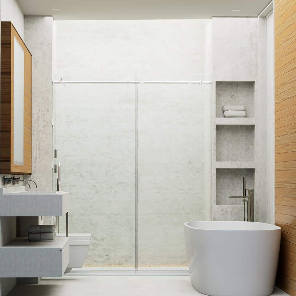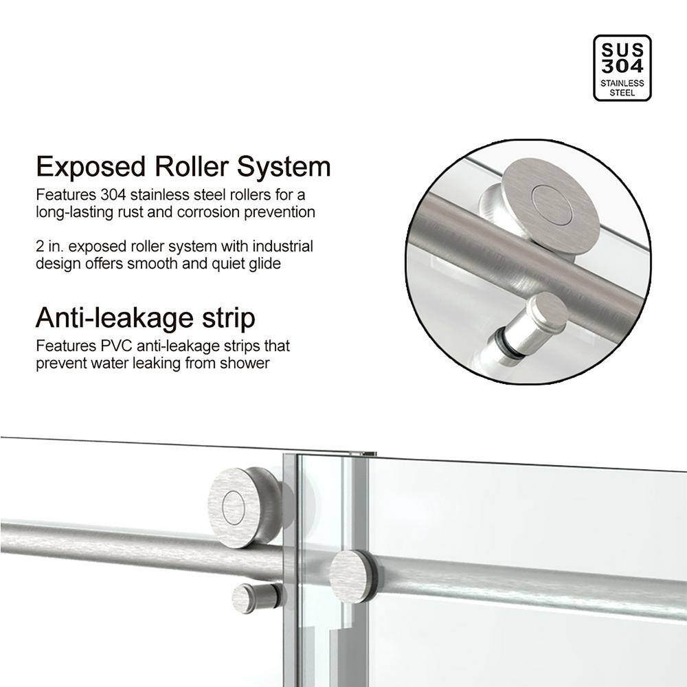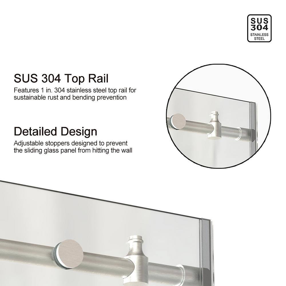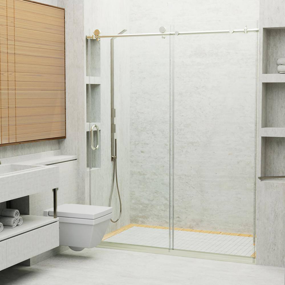 Elevate your bathroom's aesthetic and functionality with the Staykiwi 60-inch Sliding Frameless Shower Door. Finished in elegant brushed nickel with frosted glass, this door adds a stylish and contemporary touch to any shower space while providing the privacy you desire.