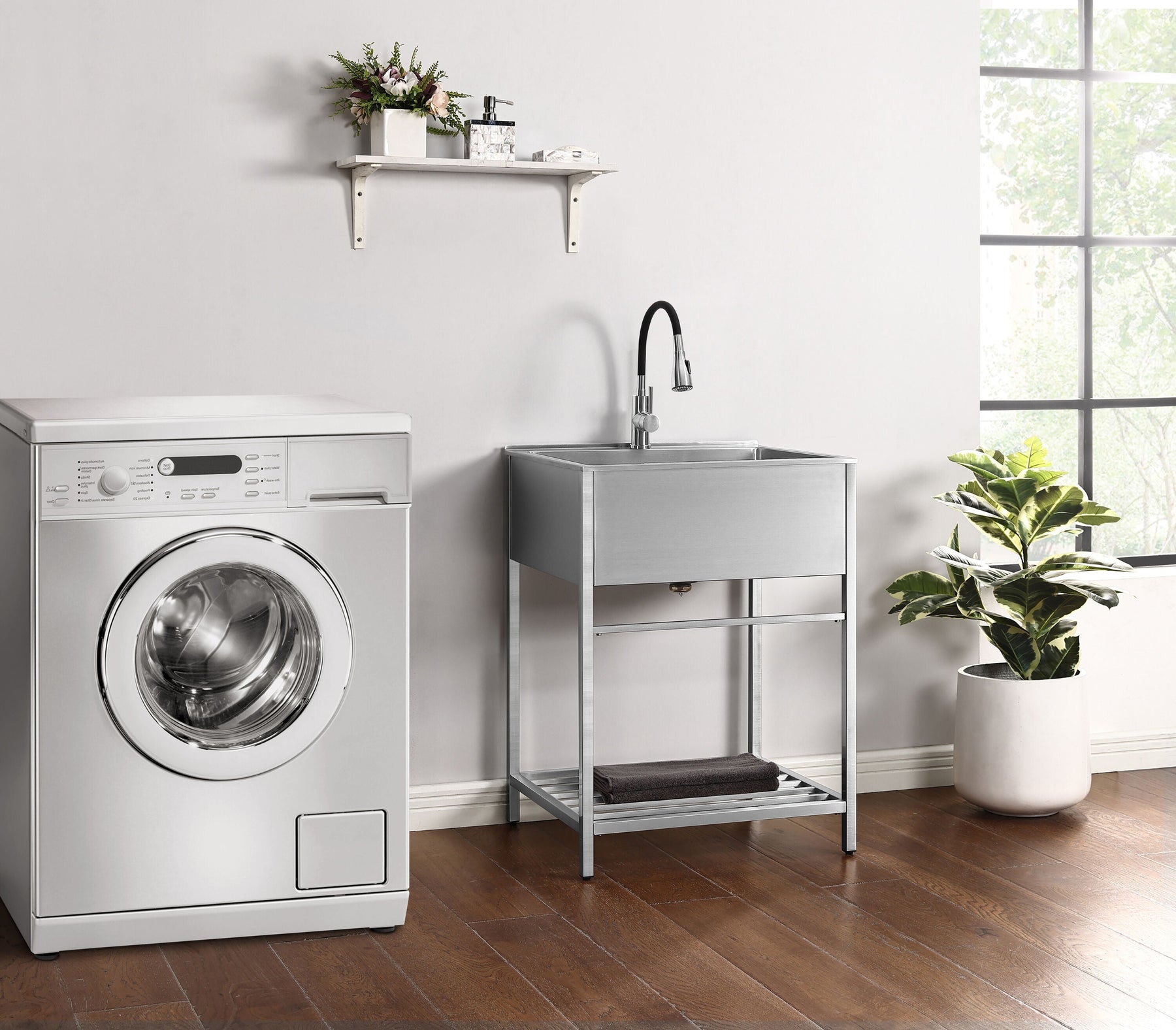 Transform your laundry room with the Style Selections Stainless Steel Freestanding Laundry Sink. This versatile unit features a deep basin and a flexible faucet for ultimate cleaning convenience. Perfect for laundry, mudrooms, or garages, its stainless steel design ensures durability and easy cleaning.