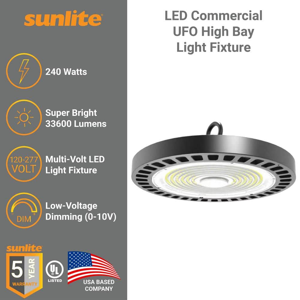 Enhance your commercial space with the Sunlite Integrated LED High Bay Light, delivering a powerful 33,600 lumens with a crisp 5000K daylight color. This energy-efficient fixture uses just 240 watts, offering substantial savings over traditional high bay lighting. Perfect for warehouses and workshops, it promises long-lasting performance with a sleek UFO design.