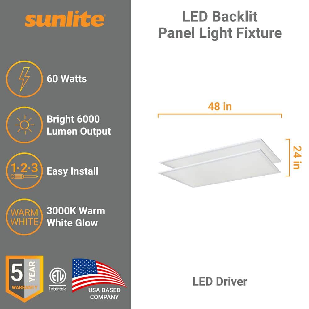 The Sunlite Dimmable 2x4 LED Flat Panel Light offers a sleek and efficient lighting solution for commercial or residential spaces. With integrated LED technology, it delivers a bright 6000 lumens while using only 60 watts. This ENERGY STAR rated light is perfect for damp locations and offers longevity with a 50,000-hour lifespan.