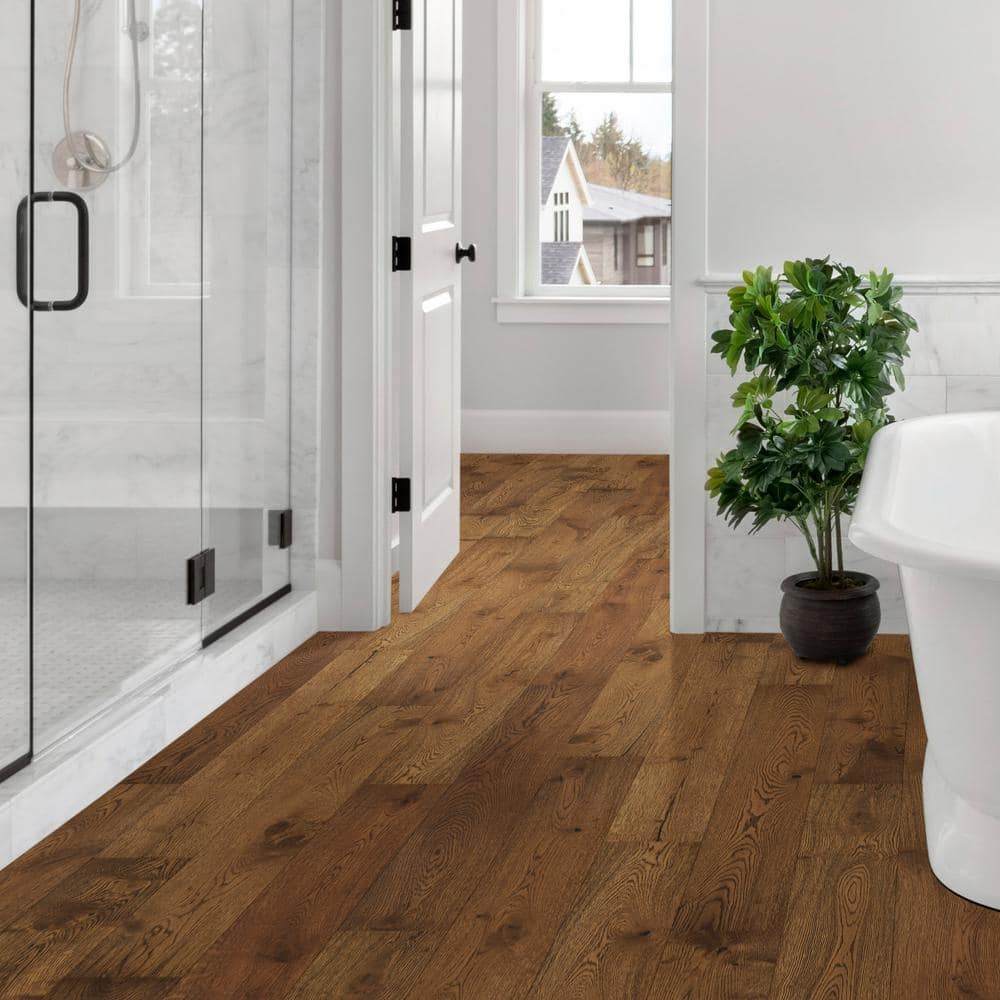 Experience the timeless elegance of real hardwood with the Sure+ Gingerbread Oak Engineered Hardwood Flooring. Its waterproof construction combines the rich beauty of wire-brushed white oak with a tough, scratch-resistant finish, perfect for any room, even kitchens and bathrooms. The easy click-lock installation and attached underlayment pad make it ideal for both pros and DIYers.