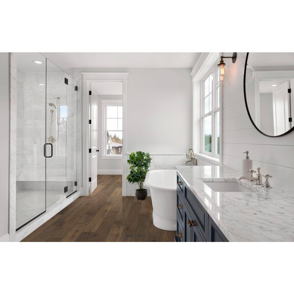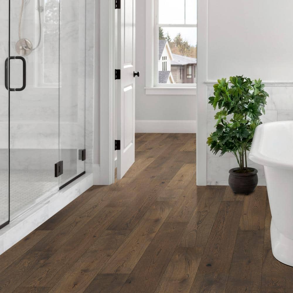 The Sure+ Khaki Brown Oak Engineered Hardwood Flooring combines the elegance of real wood with the resilience of waterproof technology. Featuring a multi-stained, wire-brushed finish, this flooring offers a refined aesthetic with textured detail, perfect for any room, including bathrooms and kitchens. With a click-lock design and attached underlayment pad, installation is seamless and suitable for DIY projects, offering both visual appeal and durability for active households.