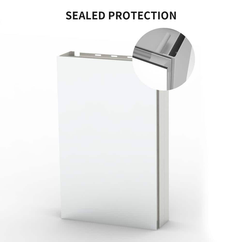 A: The cabinet is constructed with a copper-free silver mirror and anodized aluminum frame, ensuring rust resistance and durability.