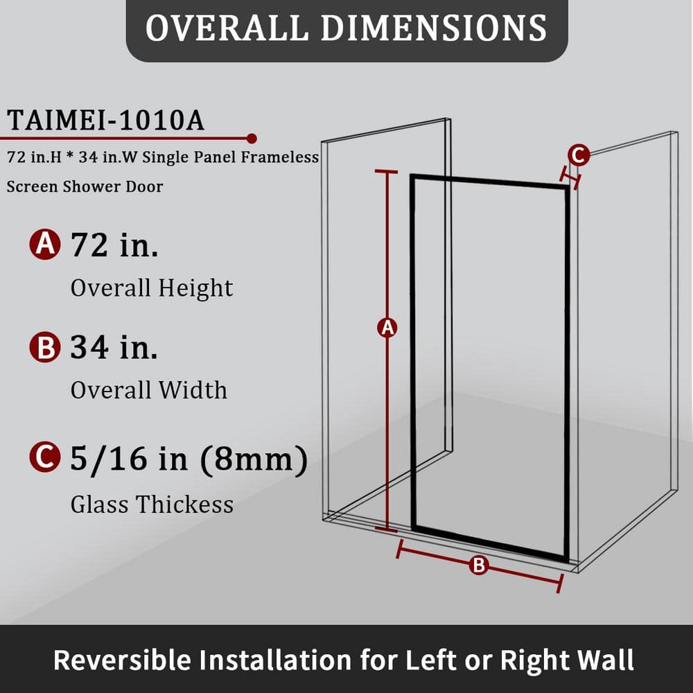 A: The TaiMei Fixed Framed Shower Door measures 34 inches in width and 72 inches in height.