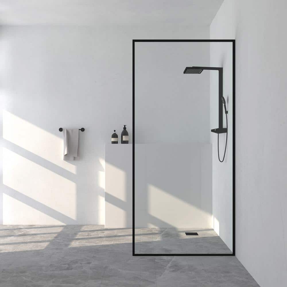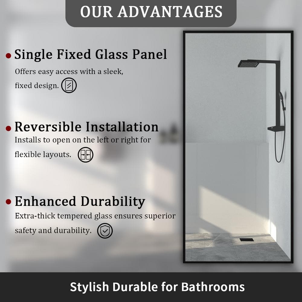 This TaiMei Fixed Framed Shower Door features a modern matte black finish with clear glass, designed to bring both elegance and contemporary style to any bathroom. Crafted with 5/16-inches ANSI-certified tempered glass, it ensures durability and safety, while allowing for a spacious entry with its versatile installation options.
