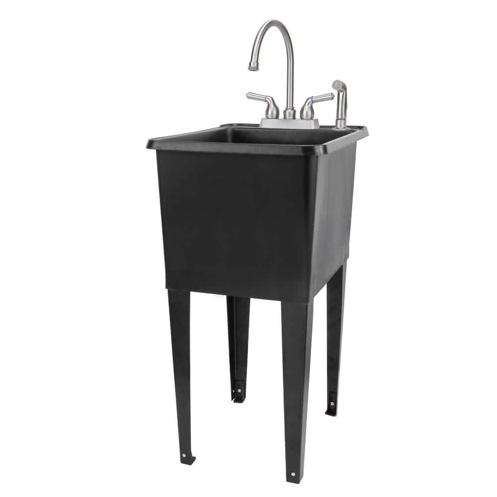 The TEHILA 17.75 in. x 23.25 in. Thermoplastic Freestanding Space Saver Utility Sink is perfect for maximizing limited spaces, offering a 16-gallon capacity and a sleek black finish. Complete with a stainless steel high-arch faucet and side sprayer, it transforms any small laundry room or utility space into a fully functional wash station.