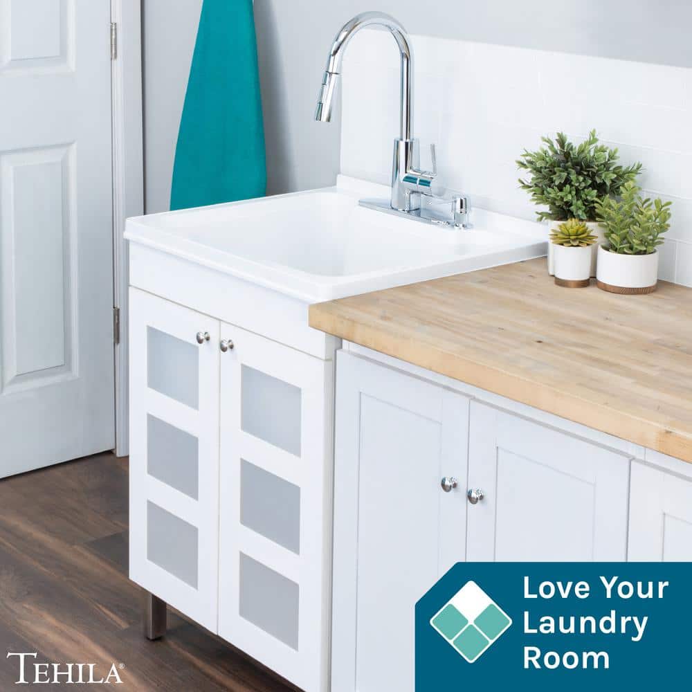 Redefine your laundry room with the TEHILA 18 Gallon Freestanding Laundry Sink, a perfect blend of luxury and practicality. Featuring a durable thermoplastic build, chrome faucet, and a sleek white cabinet, this sink is designed to make tasks efficient while enhancing decor with sophistication.