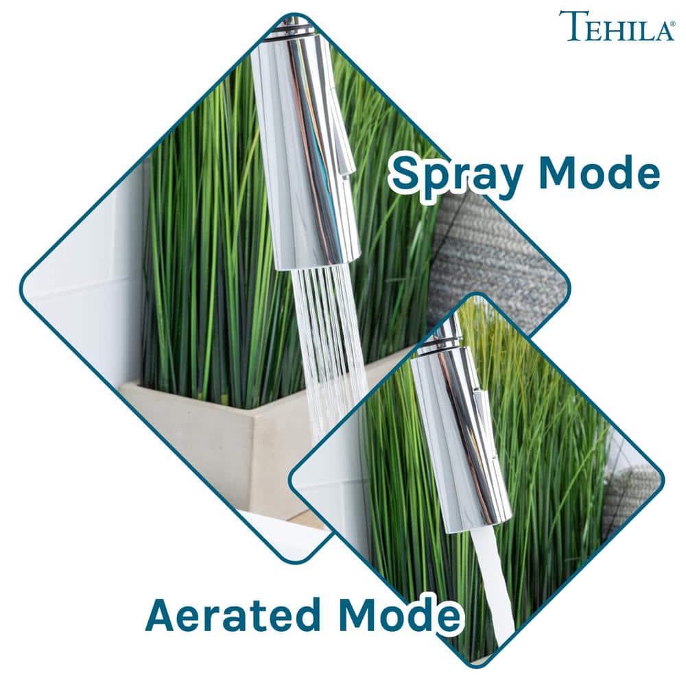 A: Yes, the faucet features a high-arc design for ease of use, a pull-down sprayer with 360-degree swivel, and a button rocker to switch between spray and aerated water.