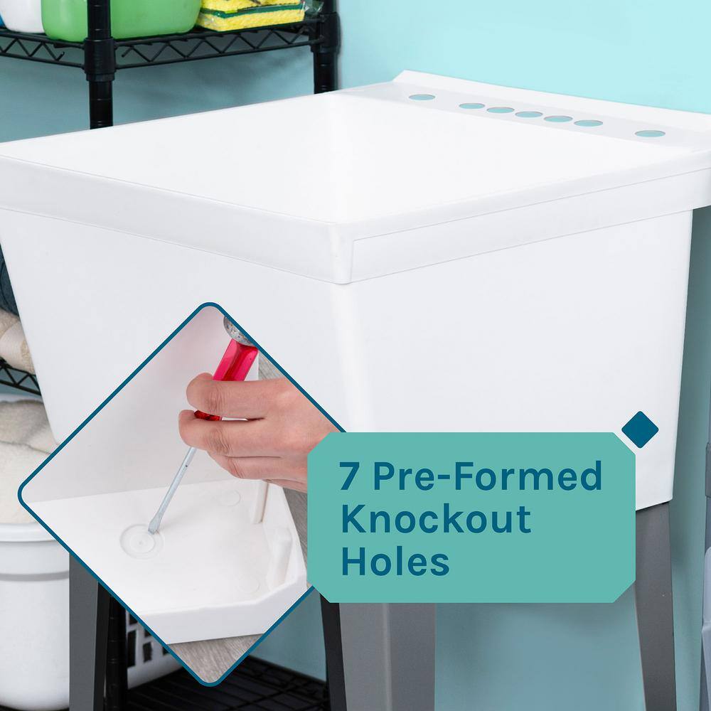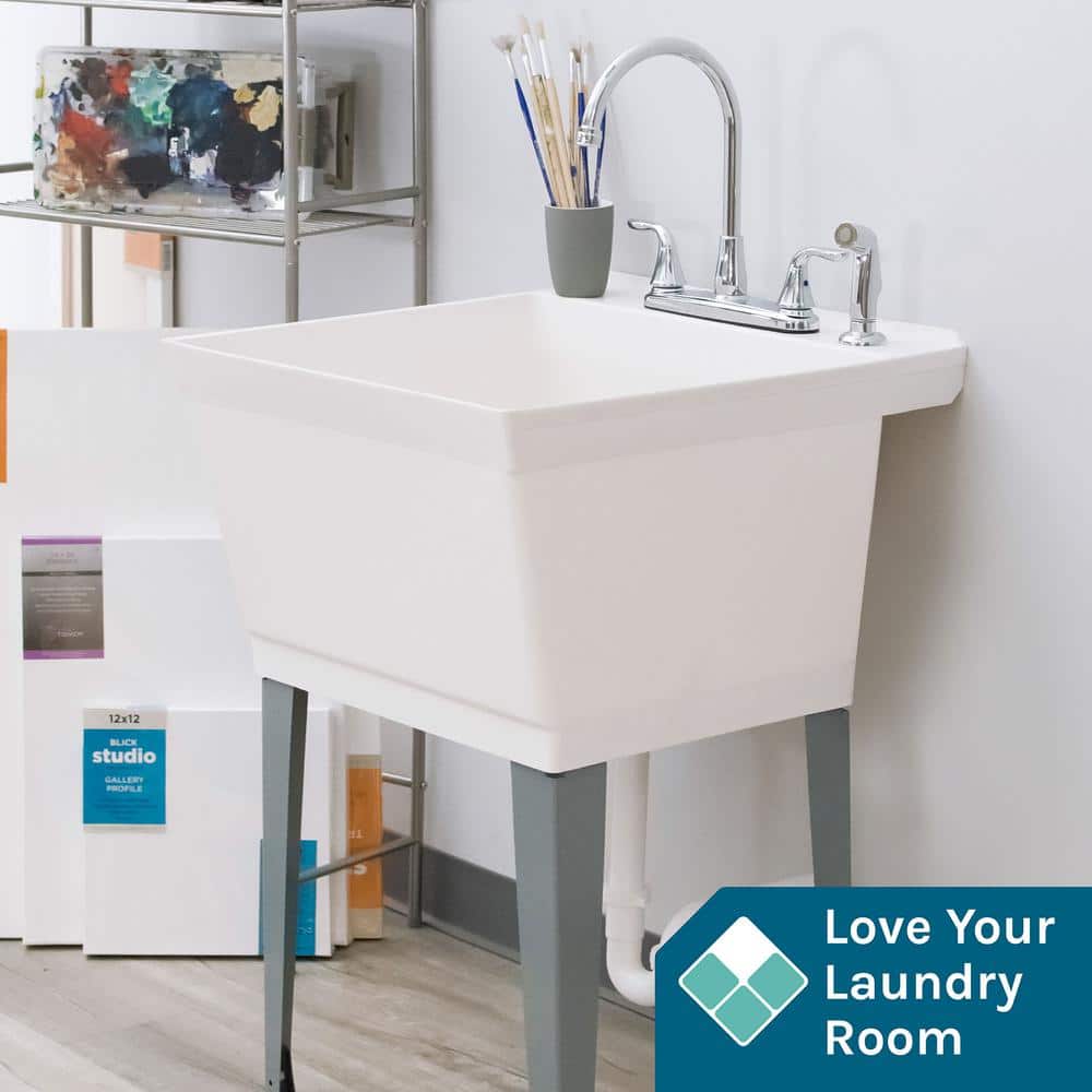 Upgrade your workspace with the TEHILA Thermoplastic Utility Sink Set, featuring a sleek chrome faucet with a side sprayer. This durable, mildew-resistant utility sink handles bulky items effortlessly thanks to its extra-deep 19-gallon thermoplastic tub. Sturdy metal legs and adjustable floor levelers ensure stable positioning, making it the perfect addition to laundry or mud rooms.