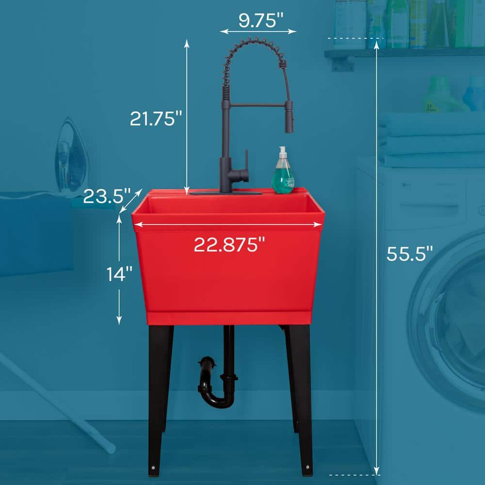 Bring vibrant functionality to your space with the TEHILA Red Utility Sink Set, a pioneering splash of color in freestanding utility sinks. Crafted from durable thermoplastic, this 19-gallon capacity tub resists stains, cracks, and mildew. Complete with a sleek black coil pull-down faucet, this sink set is engineered for easy DIY installation.